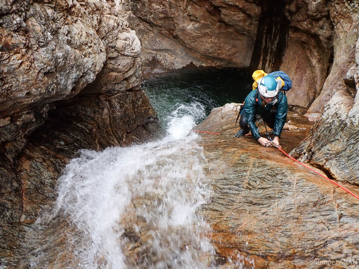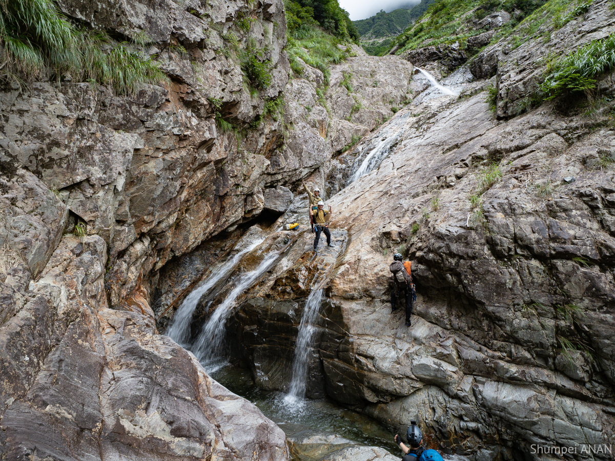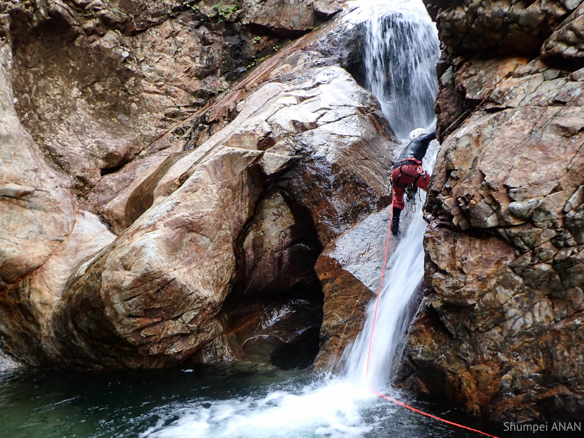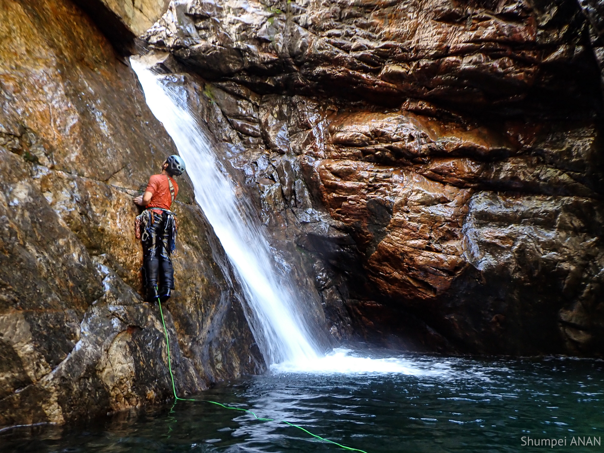 ゴルジュ最後の10m程度の滝は登れなくて、右岸から高巻いて懸垂下降で降りていく。