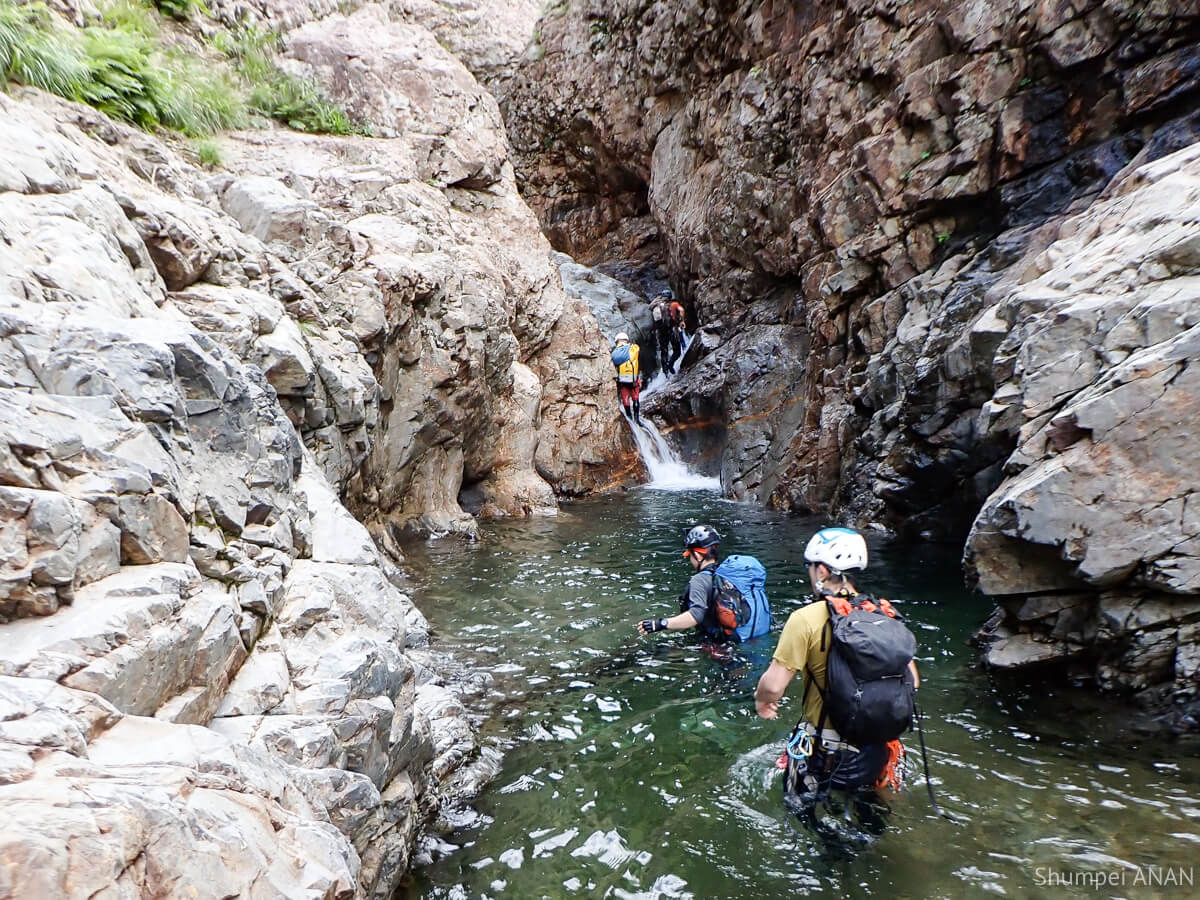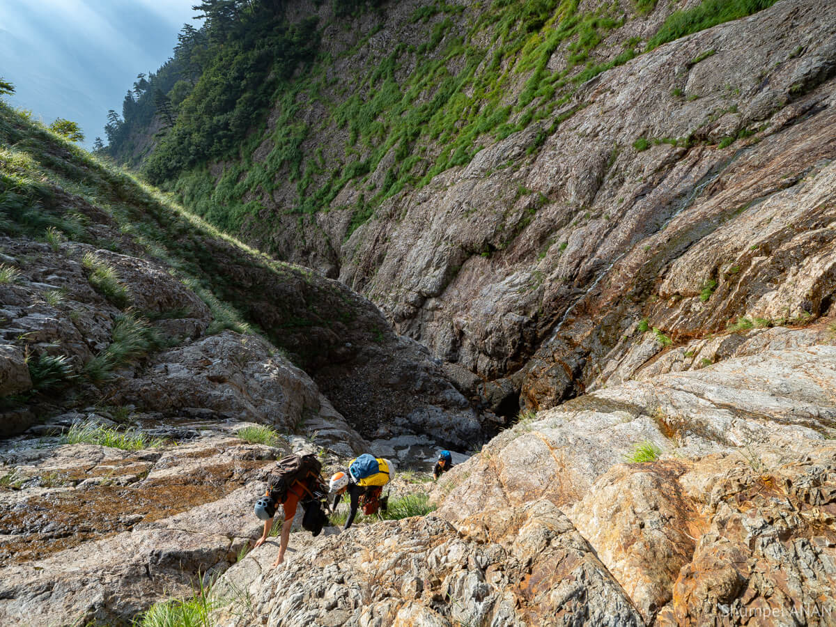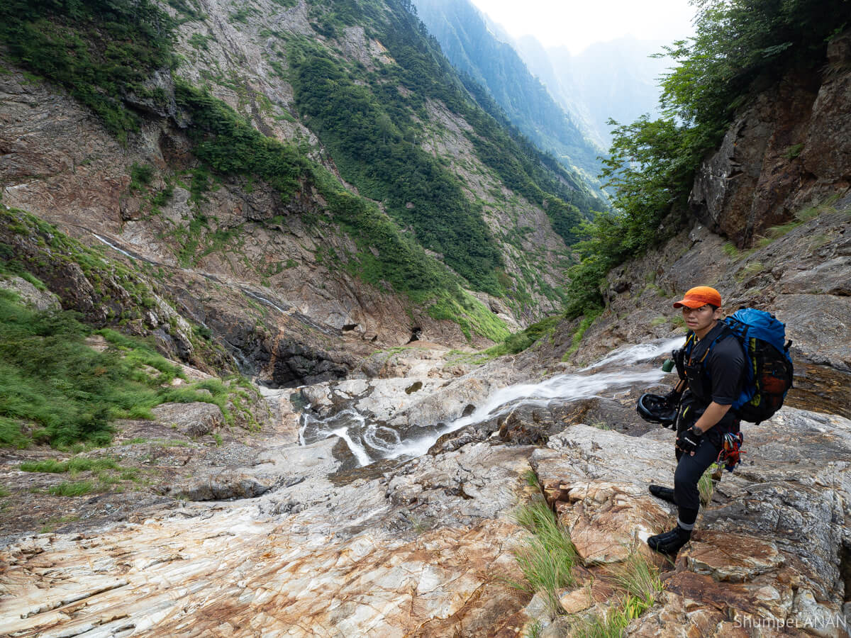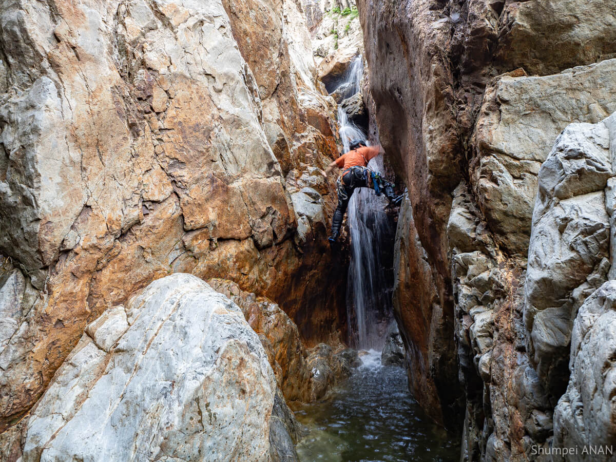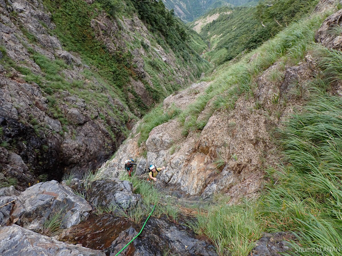ゴルジュ最後の10m程度の滝は登れなくて、右岸から高巻いて懸垂下降で降りていく。