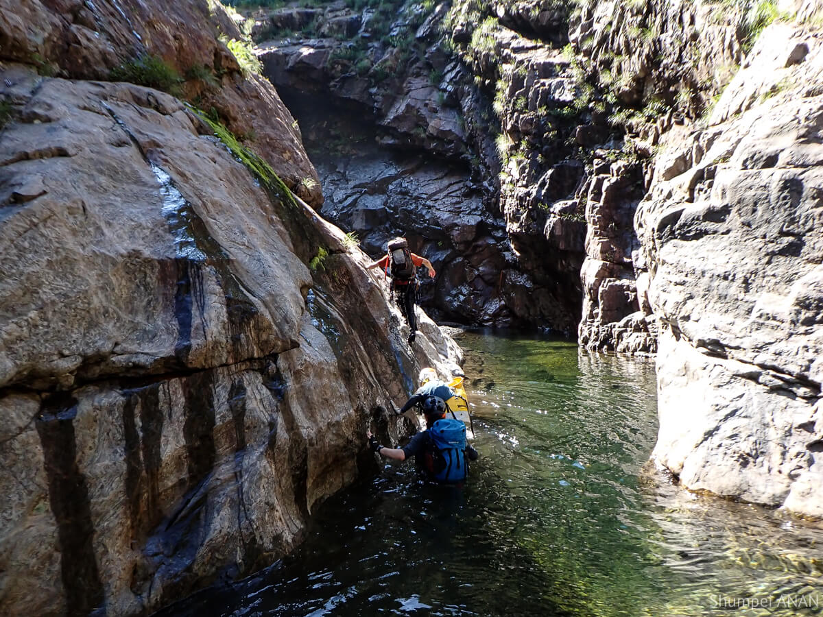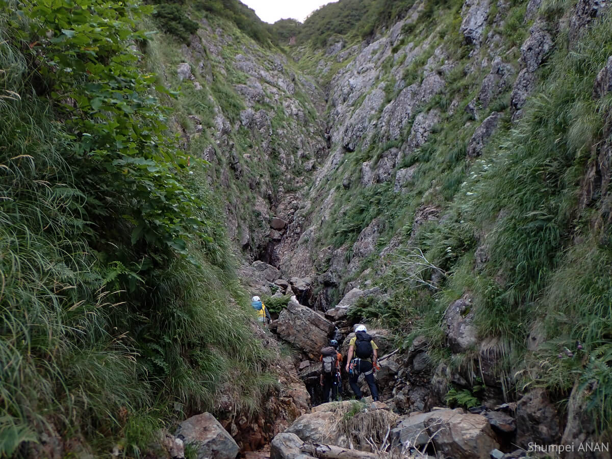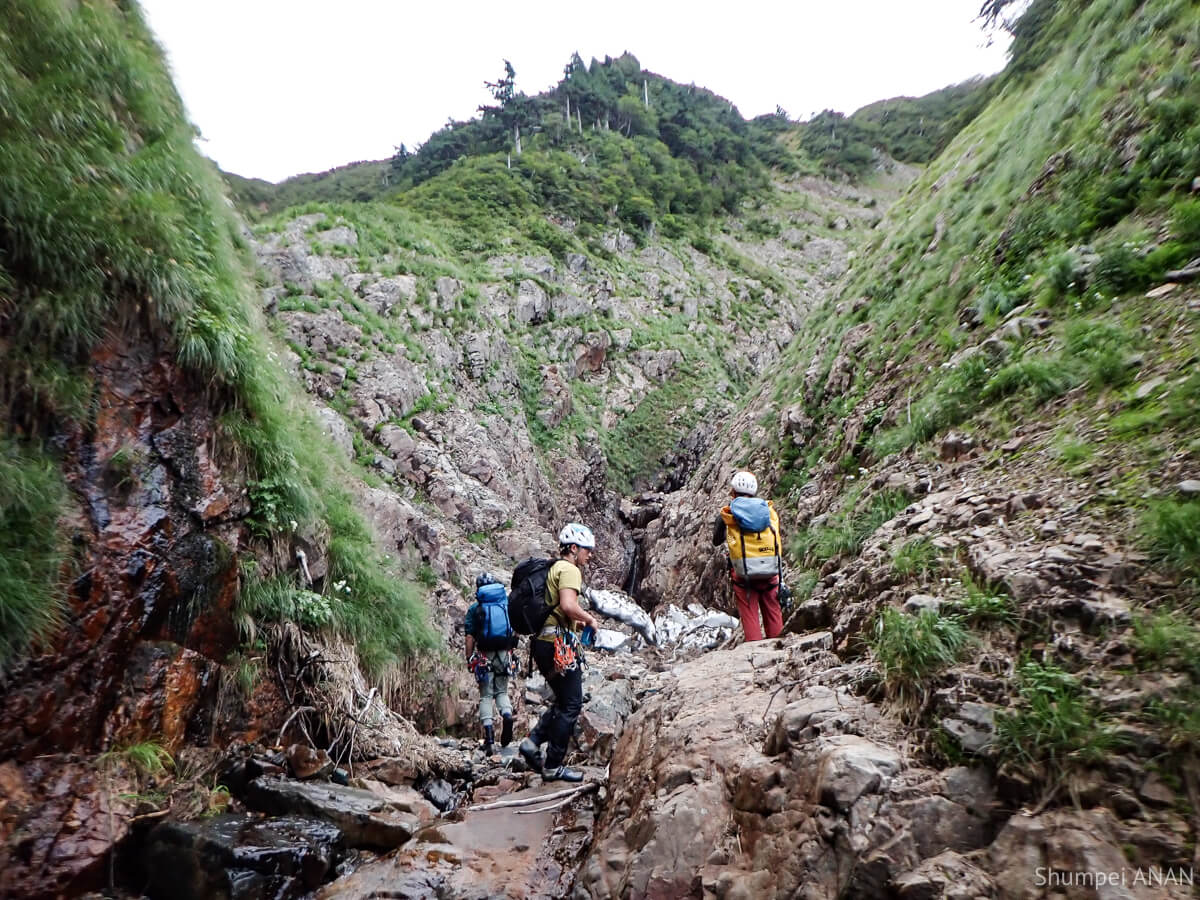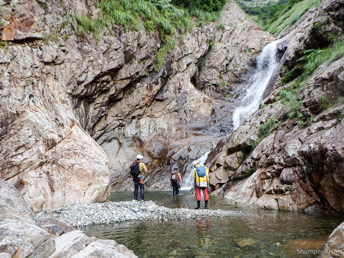 ゴルジュ最後の10m程度の滝は登れなくて、右岸から高巻いて懸垂下降で降りていく。