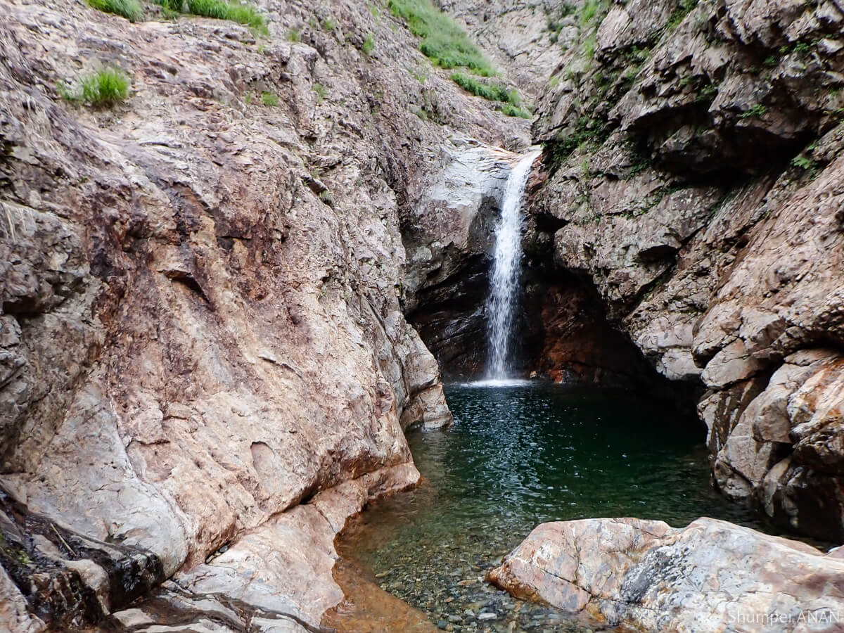 5mくらいのヌメヌメ滝を登って、右俣に入ると両岸がくっつかんばかりに迫ったゴルジュに変貌。