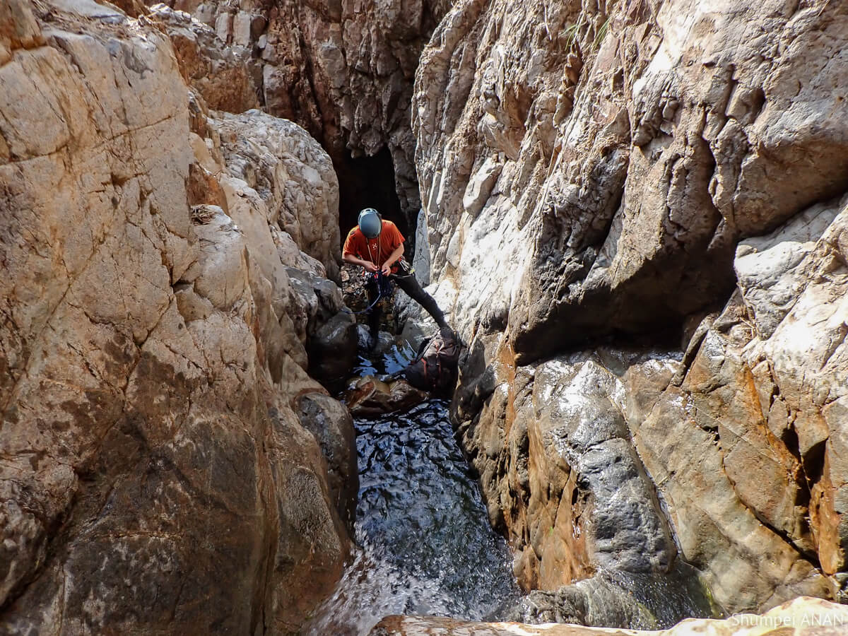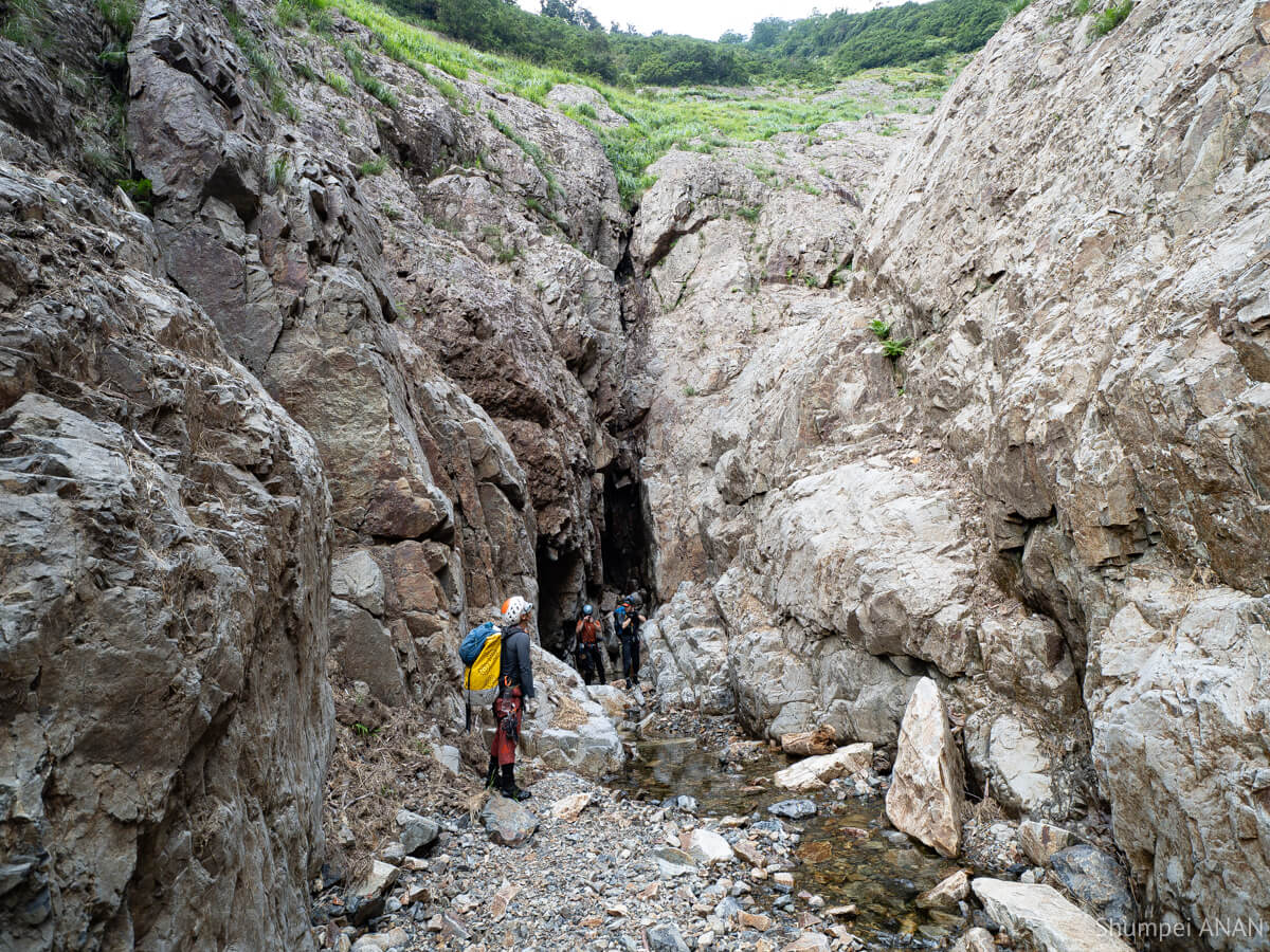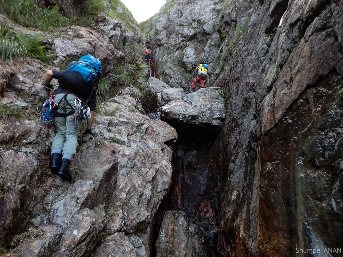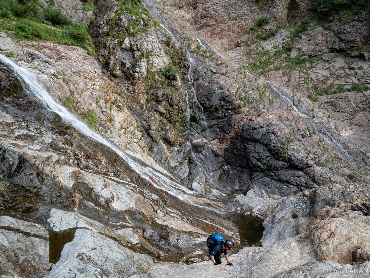 昨日見えた三俣はやや変則であり、最初にである右沢もとてつもない切れ込みだ。 この辺は地獄の底のような景色で、かなり息苦しい。 中沢は初っ端から滝が続き、一直線の切れ込みに差し掛かると難しいCSがこれでもかと連続する。 崚くんがガシガシ登っていき、荷揚げ、ユマールを繰り返す。 まるでゴルジュ宅急便。