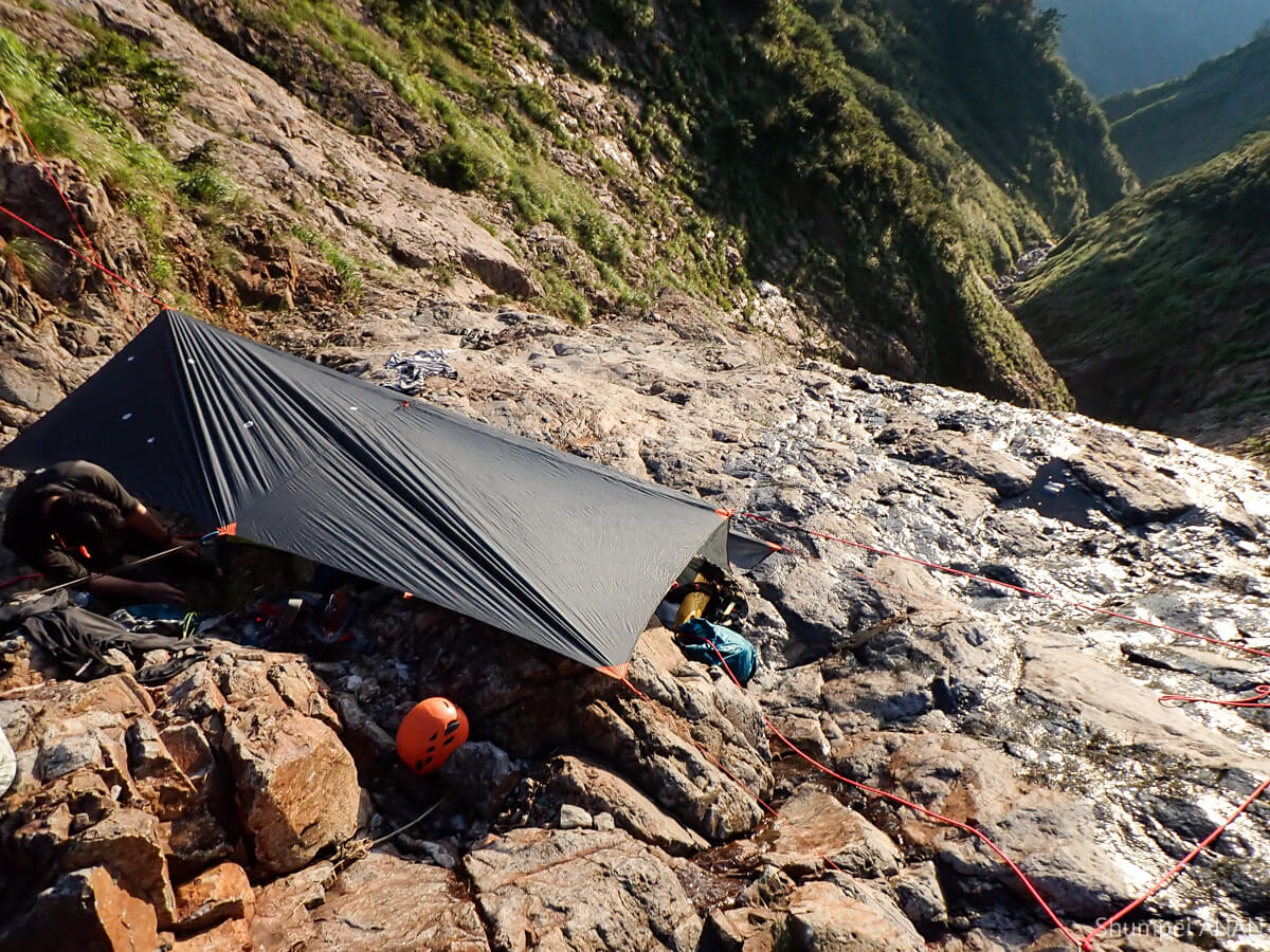 ゴルジュの先にはすごい深さの三俣が差し迫っており、結局、大滝上のスラブにある傾斜が緩い場所で幕営することに。 雨が降ろうものなら全員流されるようなすごいところにタープを張った。