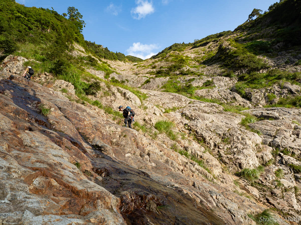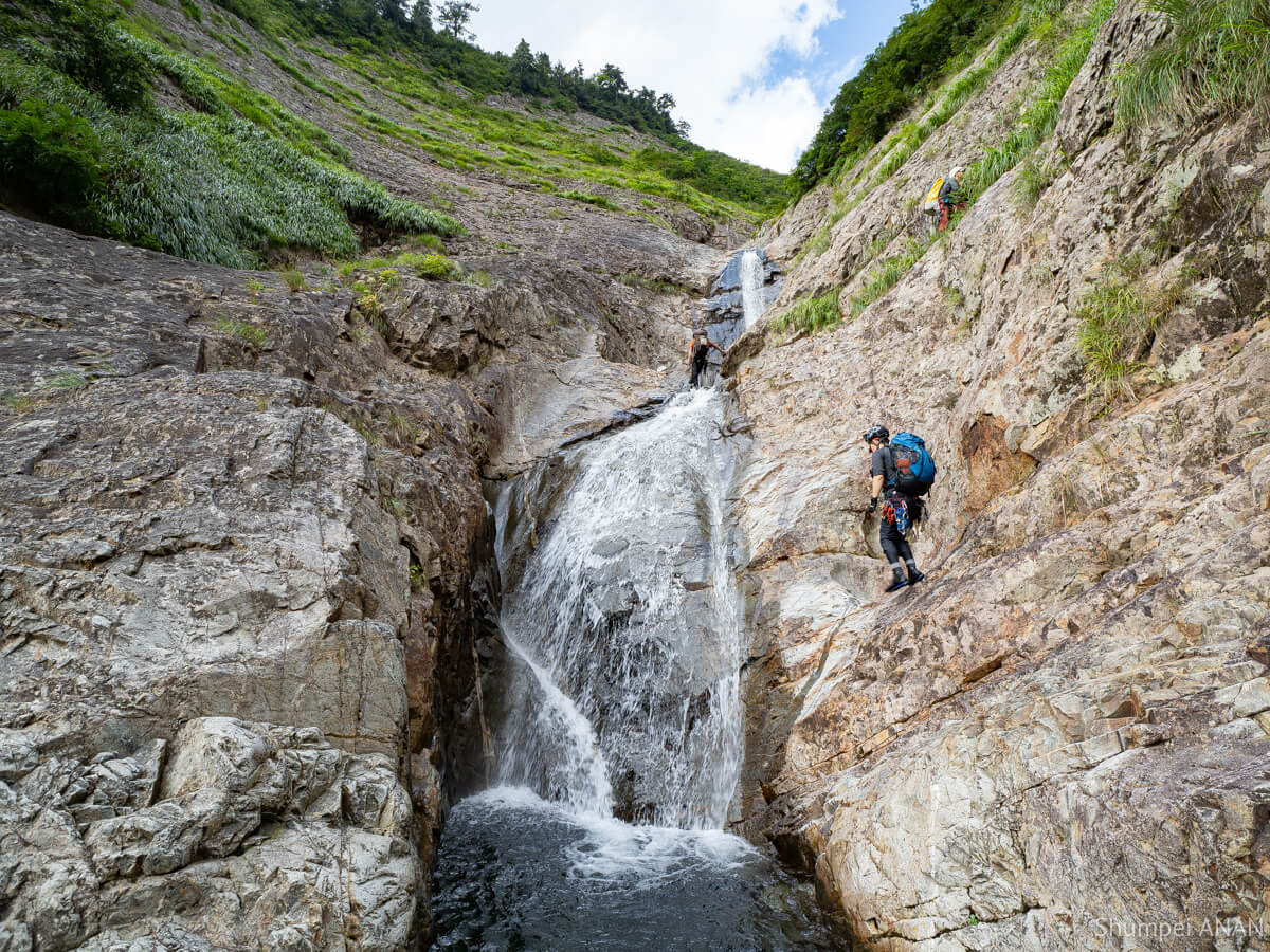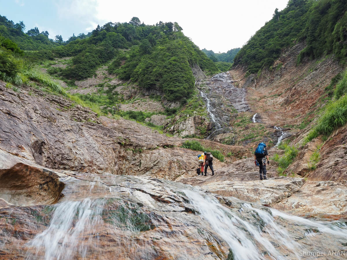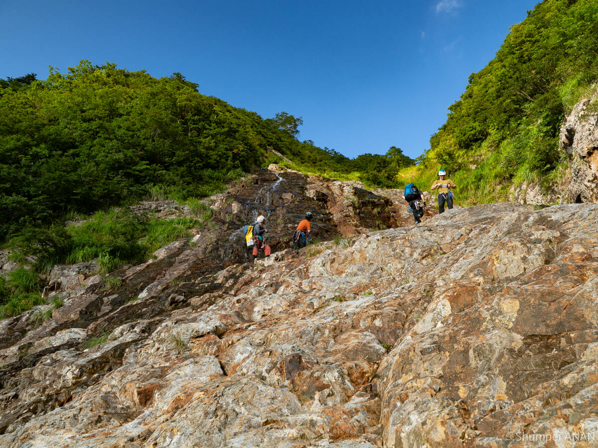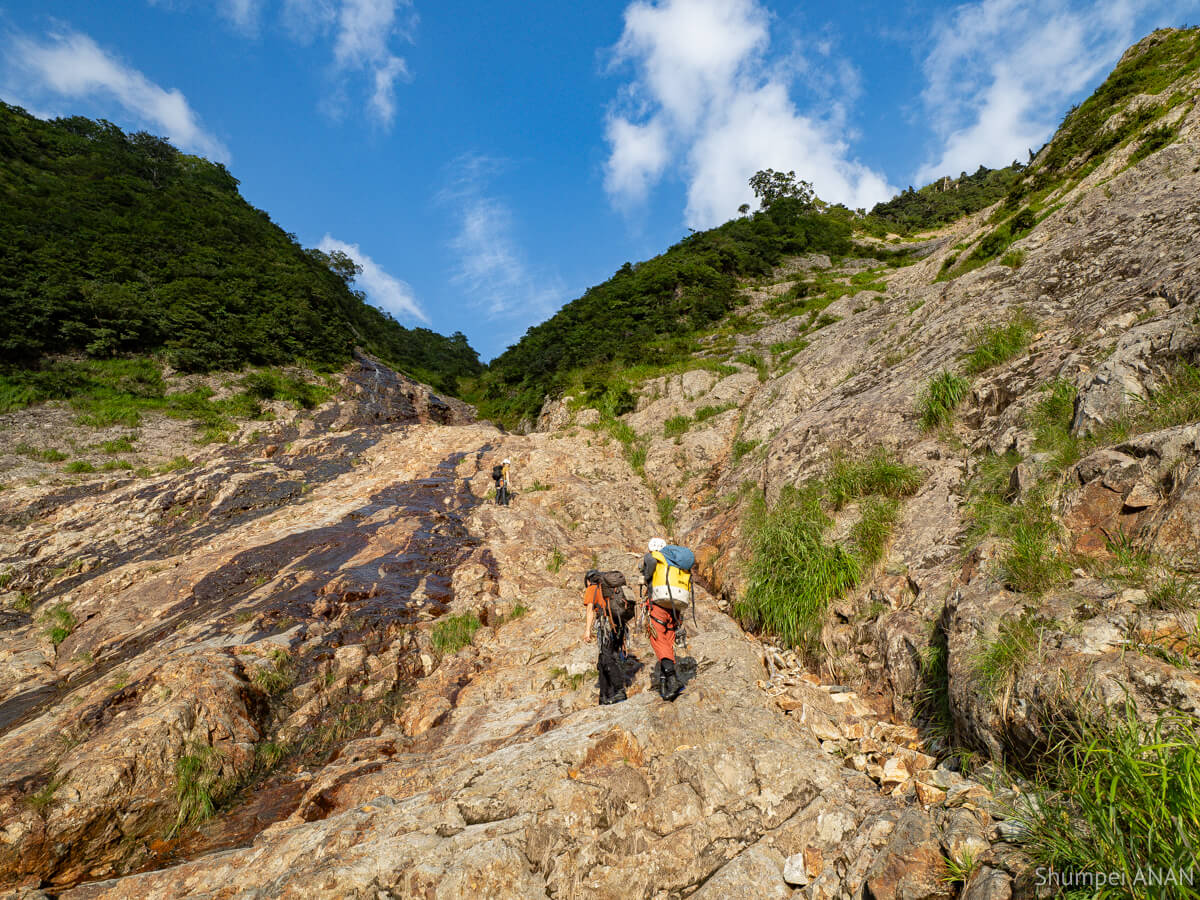 右岸側の水流は傾斜があるため、左岸のスラブから登っていく。 ところどころ慎重になるところがあるが、全体にⅢ以内の内容で快適に登ることができる。