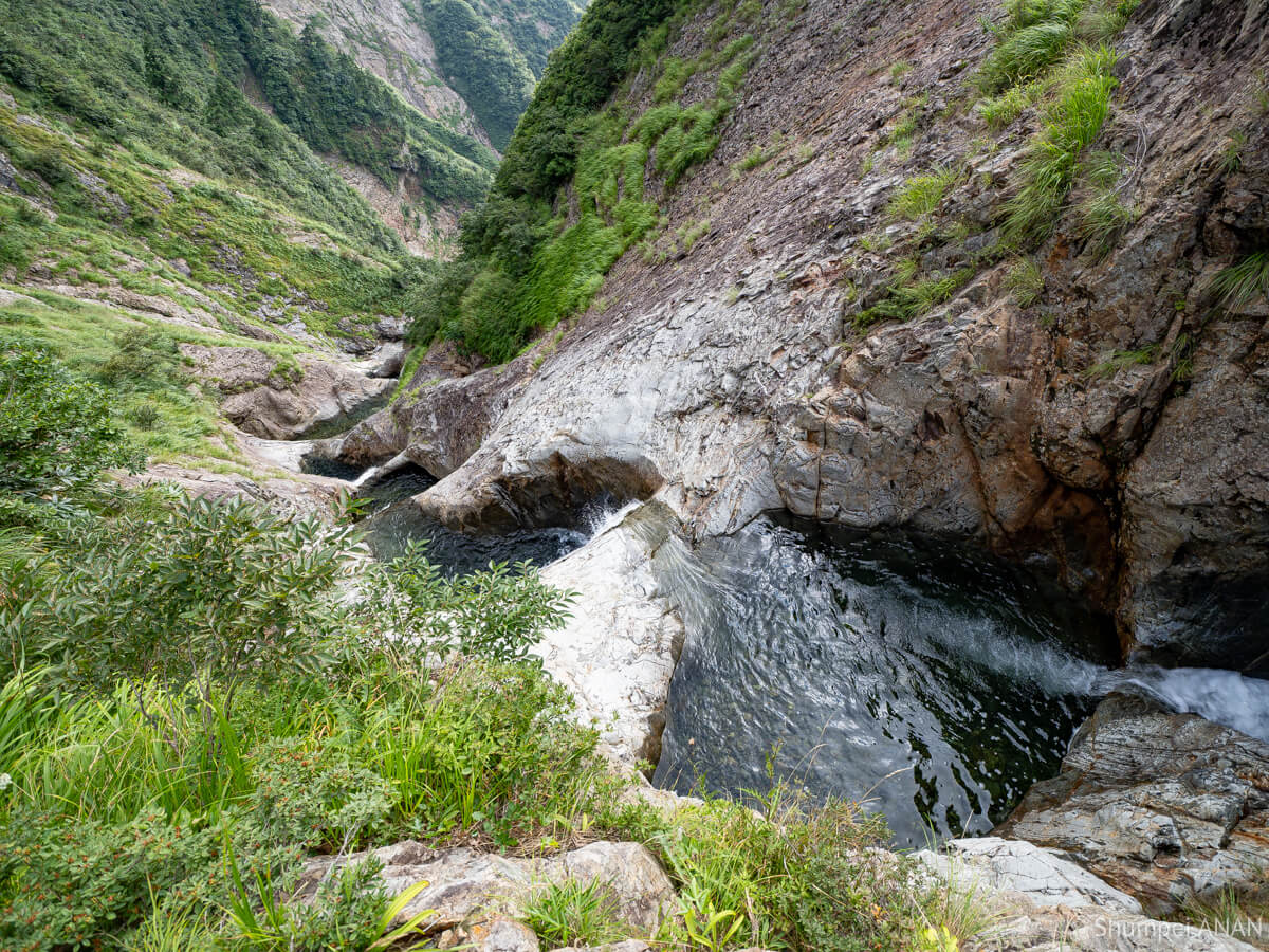 長く続いた連瀑を上から覗くと、釜と滝が連続しているのがよく見て取れる。 黒々とした釜は一体どのくらいの深さがあるのだろうか?