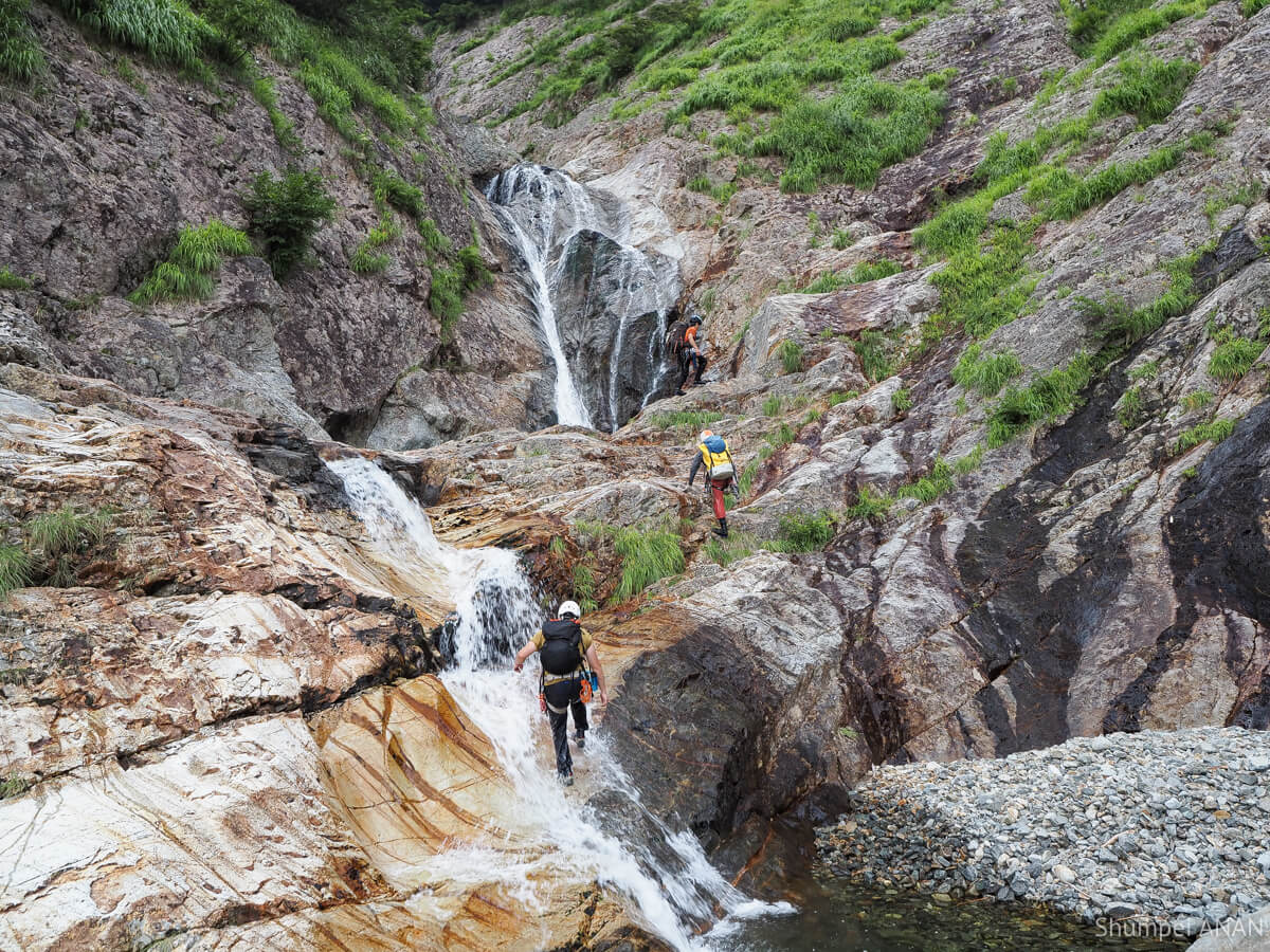 北沢は100mを超す連瀑を形成しており、水量もある。全体のスケール感は真沢以上だ! ぐんぐん連瀑を登って標高を上げていく。5人という人数でもロープを出さずに各々登っていくため全く時間はかからない。
