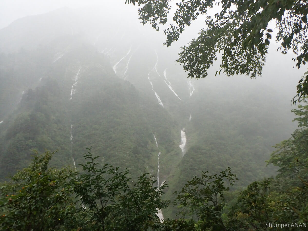 徐々に雲行きは怪しくなってきた。極楽新道を下山中にとうとう凄まじい豪雨になって、周囲岸壁に1000m級の大滝が無数に出現。これには笑うしかない 経験したことのないような大雨だが悲壮感はなく、むしろこれどうなっちゃうのって感じでおもろくなってきた。