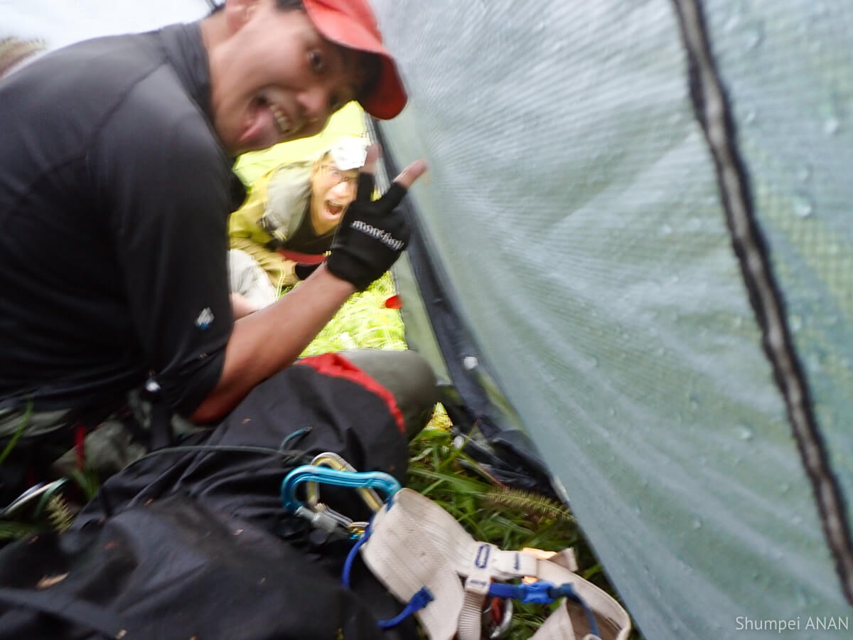 とはいえ行動できるものでもなく十二平でタープを張って雨を凌ぐ 下山してきた他の沢ヤ・登山者もタープに入れて雨足が弱まるのを待った。 KCたちが先に偵察に行くも普段水の無いような枝沢でもロープ渡渉が必要なほどの増水だとか… 2時間ほどタープの下で雨宿り。 雨もだいぶ落ち着いてきた頃、一緒に雨宿りしていた水戸葵ptが偵察に行き、なんとわざわざ駐車場まで行けることを確認してきてくれた。
