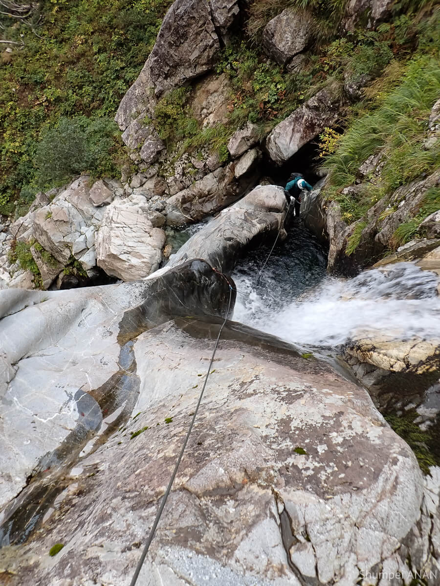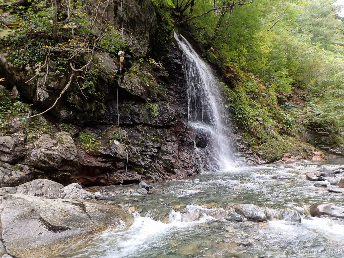 見附川への山越えは2時間程度だ、テープもあり分かりやすいが、下降沢はちょくちょくクライムダウンがある。最後は空中懸垂で見附川に降りる。ここは上流側に踏み跡があって本来懸垂下降の必要なし!
