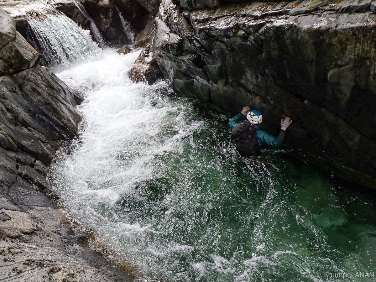 腰まで冷たい水に浸かる場面はあるものの、決定的な泳ぎは避けてこれた。しかし、高松沢出合直前でとうとう水路ゴルジュが出てきてしまい、意を決して15mほど泳ぐ。 あまりの寒さに絶叫する。まじに気絶するかと思った。
