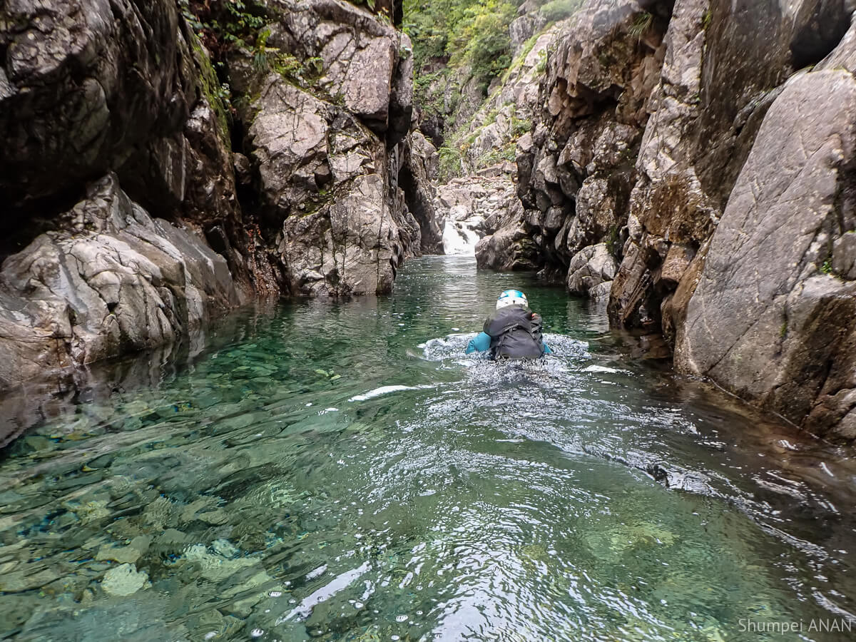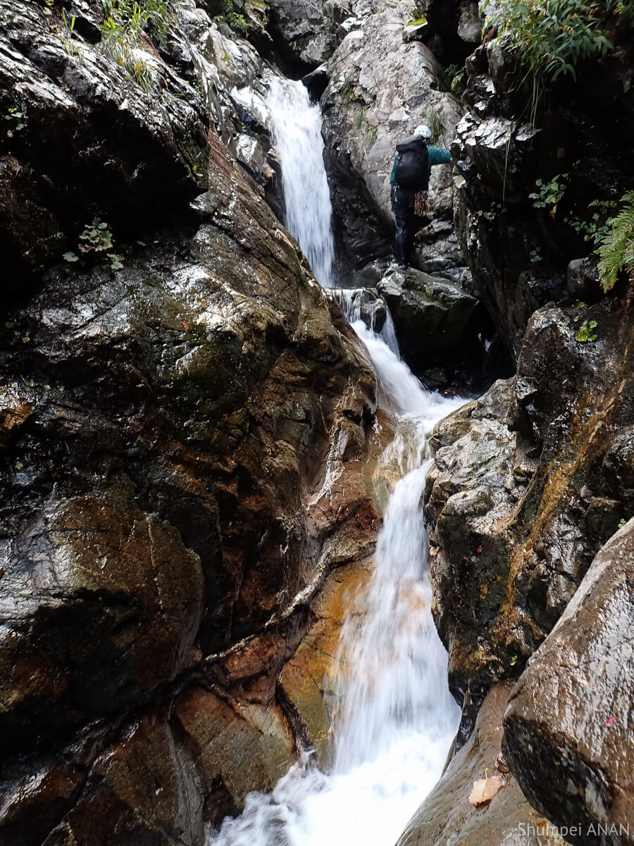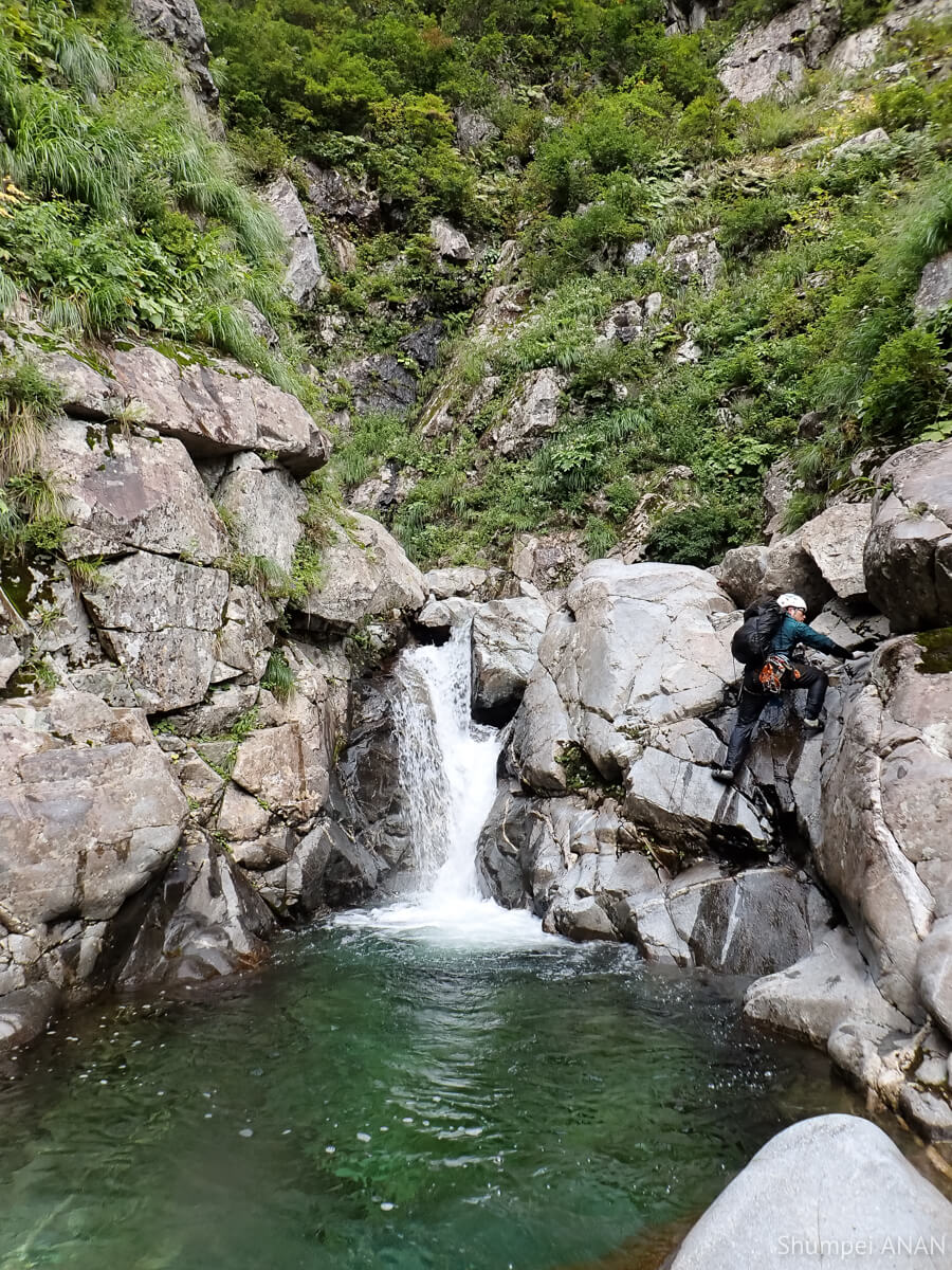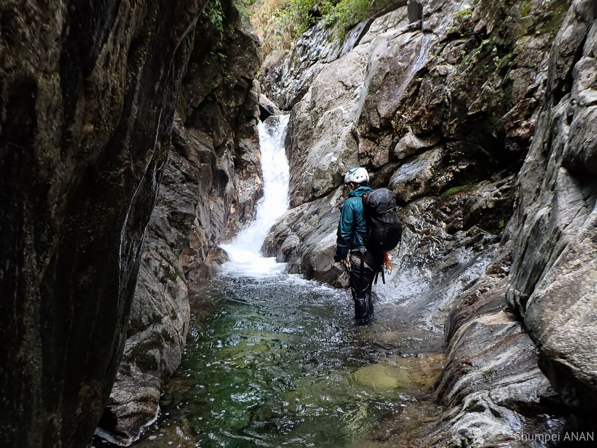 カンテ滝はツルツルで支点も取れないので、一歩が逡巡した。この滝の上も少しゴルジュが続くが厳しいものはなかった。