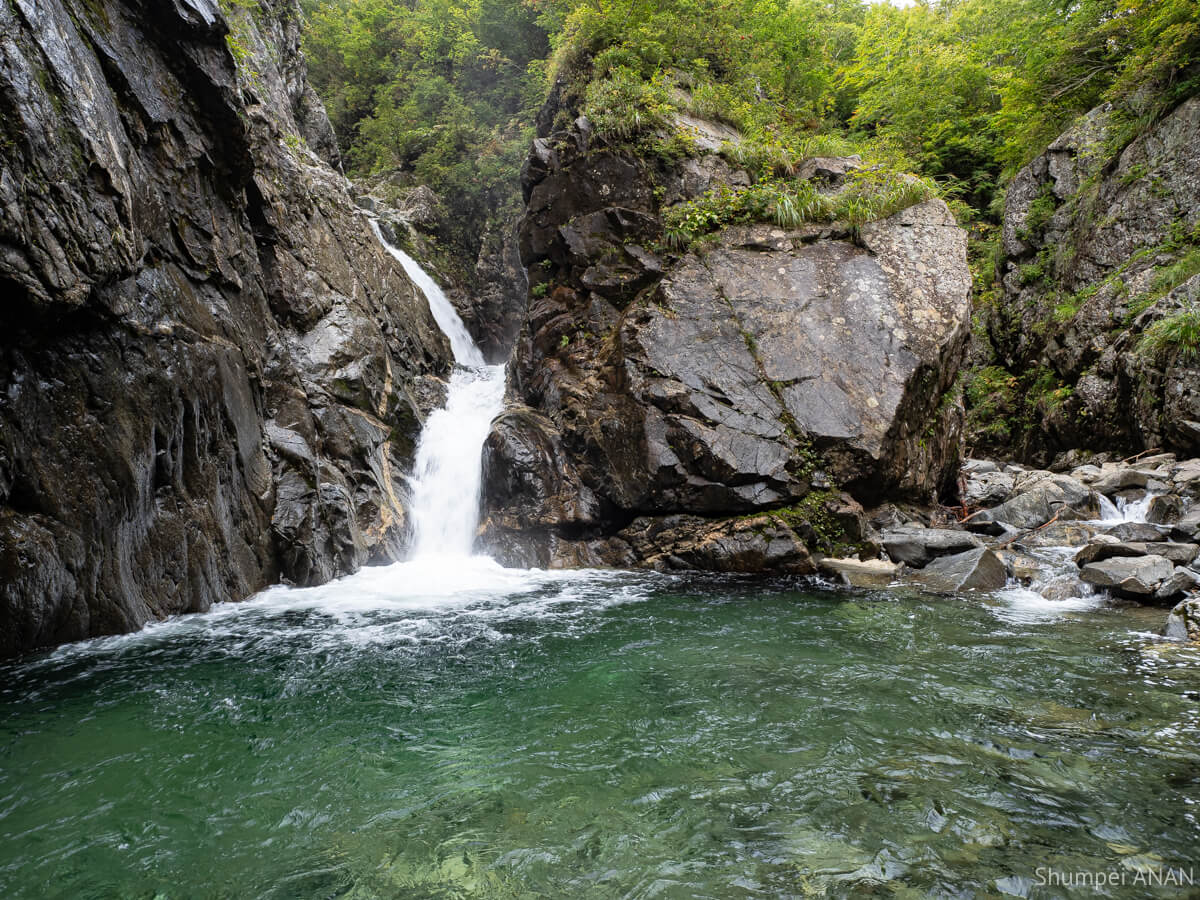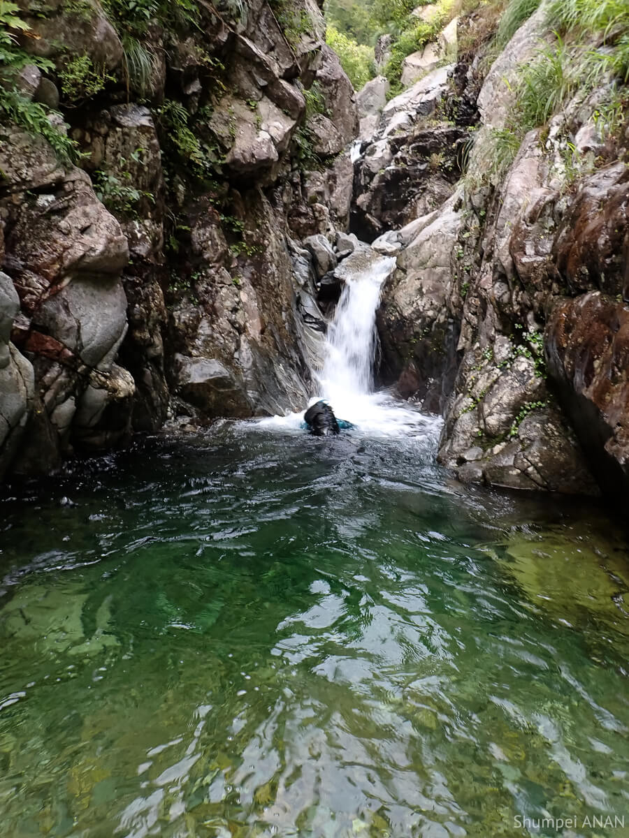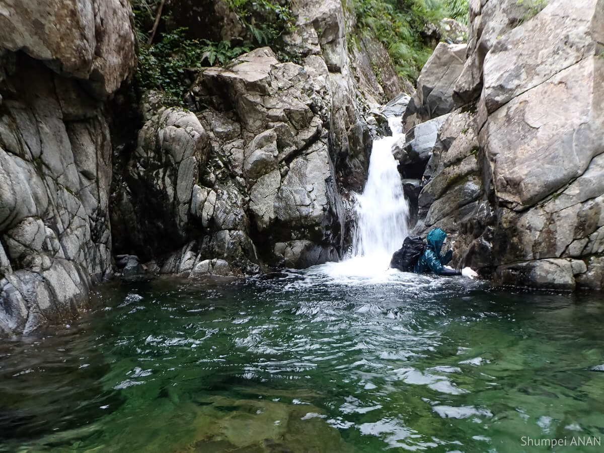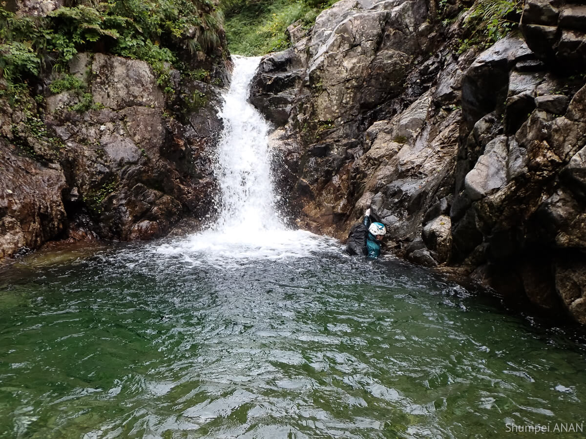 その後は次から次へと滝の連続だ。 深いゴルジュの中ではないので、閉塞感はないが、釜を泳いで取り付くものが多く、その度にブルブルと震える。