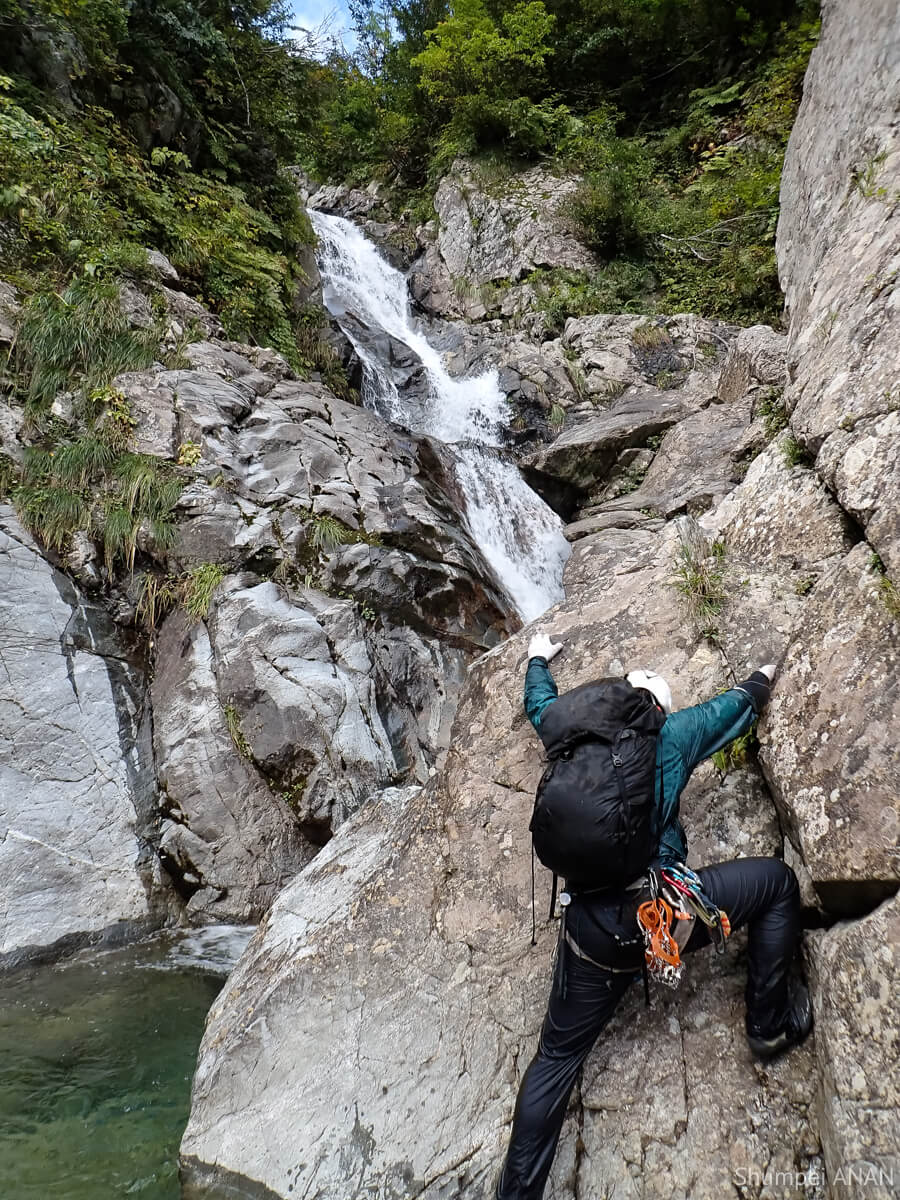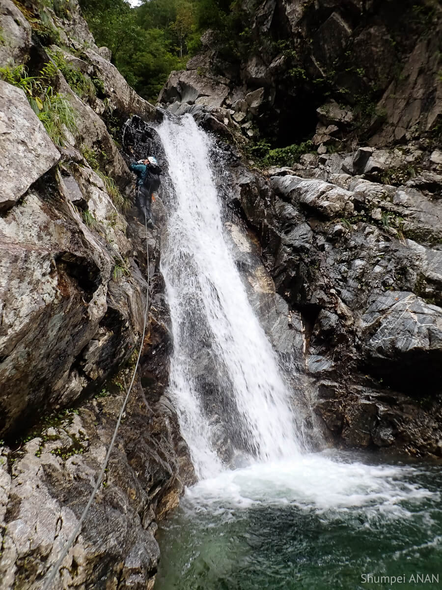 この10m直瀑はケーシリードで水線左をシャワーで行く。 最後の抜けが悪かった、KCナイスリードだね!!