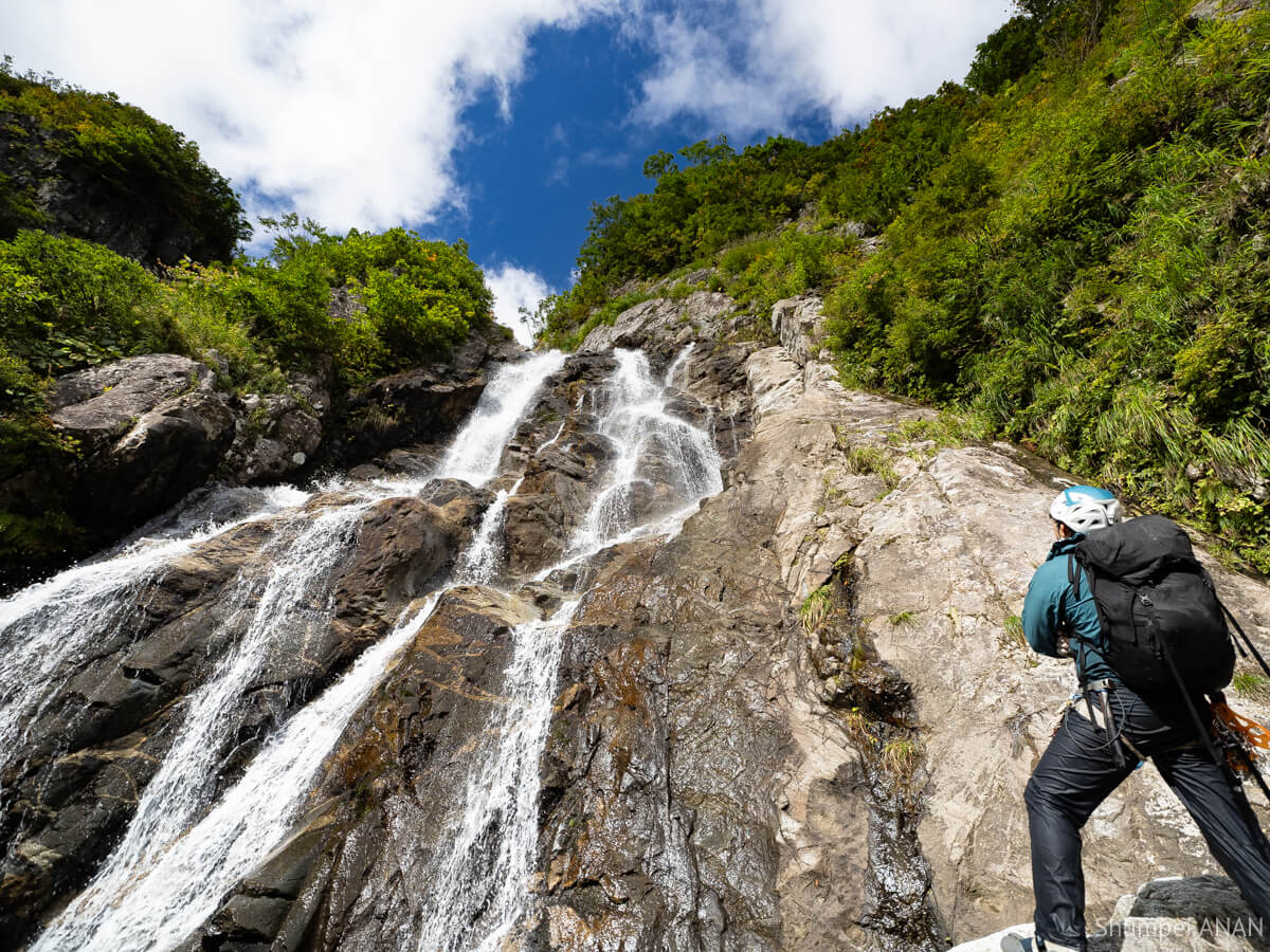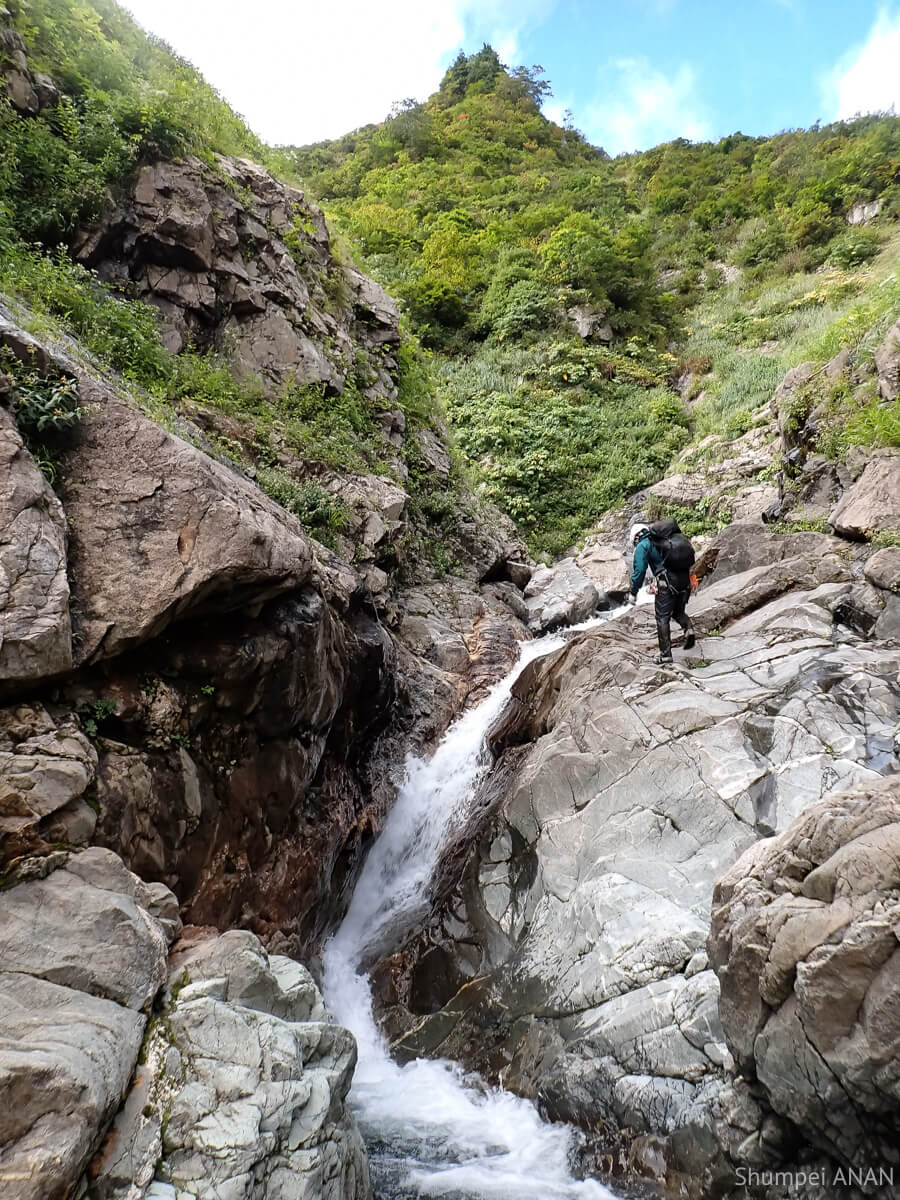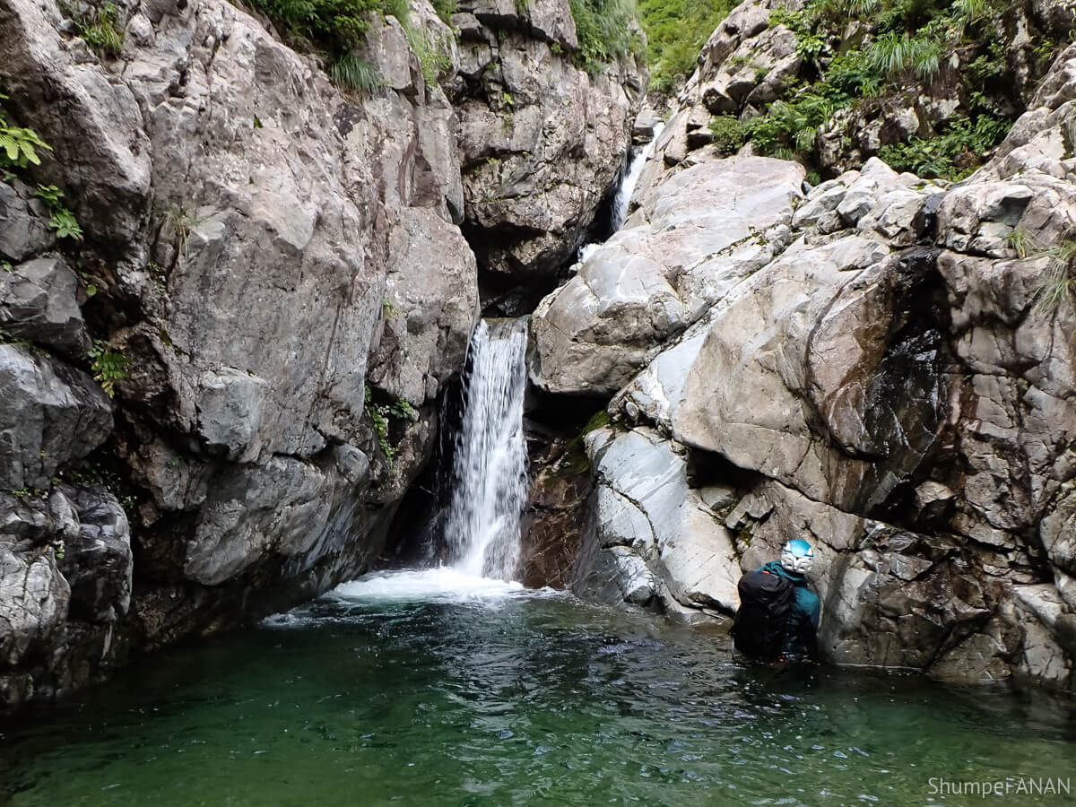 泳ぎが連続し、完全にへばりかけてきたころ、ようやく陸から登れる滝が増えてきた。そしてより岩岩しく、朝日連峰よろしくバッキバキのガッチガチの花崗岩だよ〜 太陽も出てきて一気にHP回復。