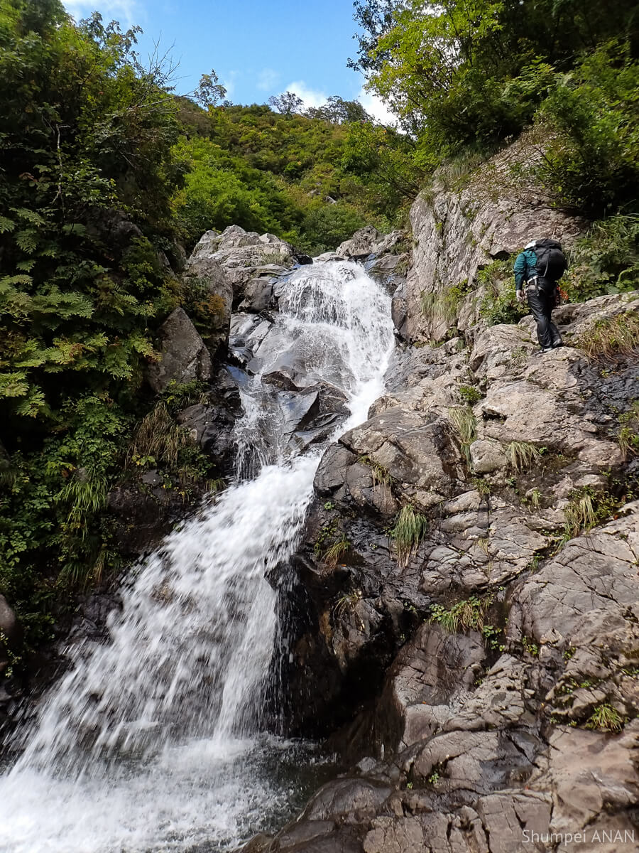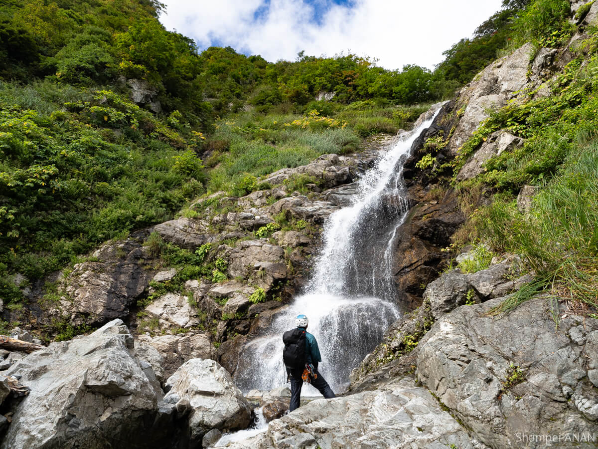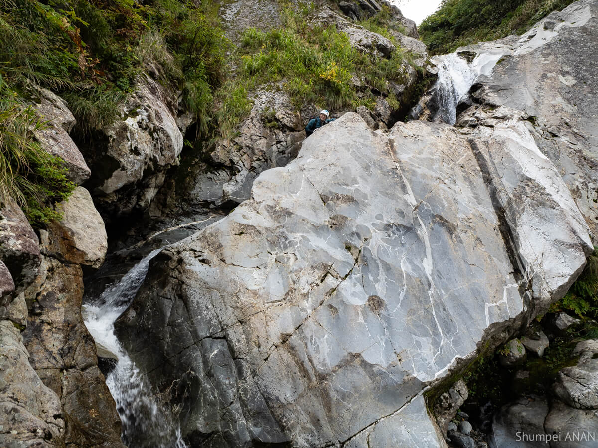 上段の30m滝は右から直登も考えたが、左の草付きから滝の際から最後は流水ラインに入って落ち口に抜けた。