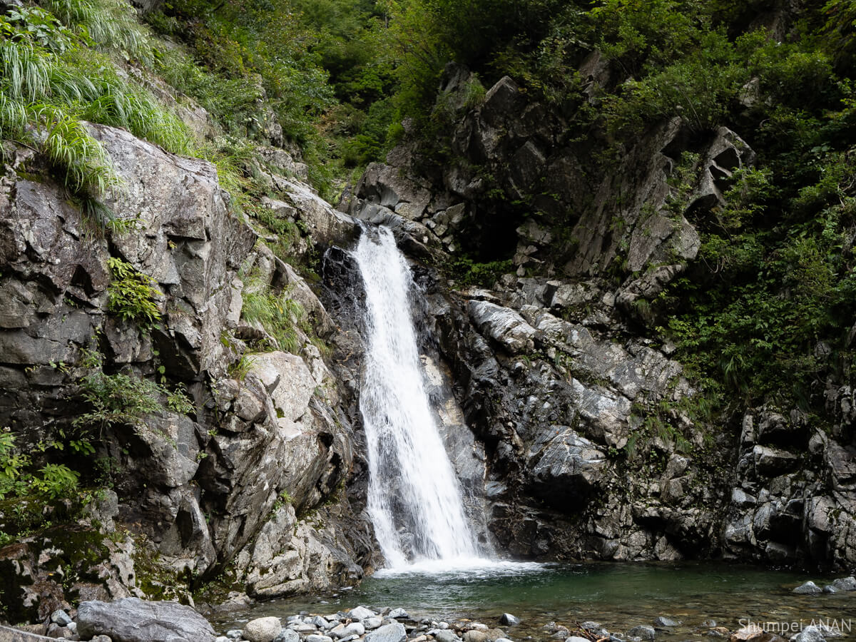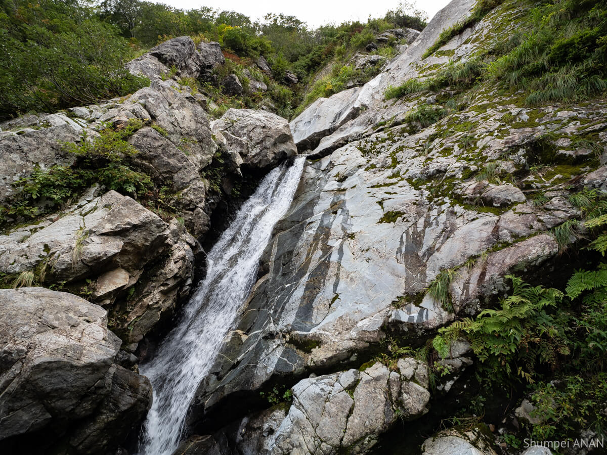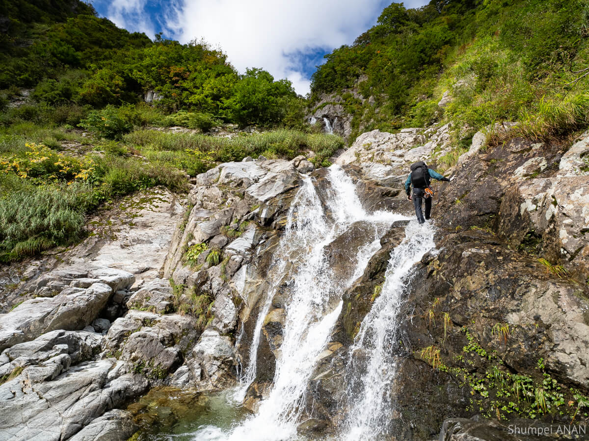 上段の30m滝は右から直登も考えたが、左の草付きから滝の際から最後は流水ラインに入って落ち口に抜けた。