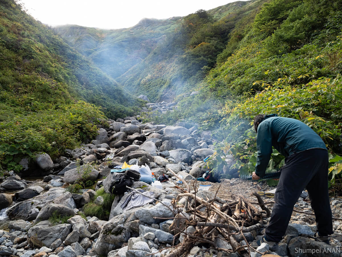 これらの滝場を超えたところで、沢は完全に開けCo1200付近の適当なところで幕営することにした。