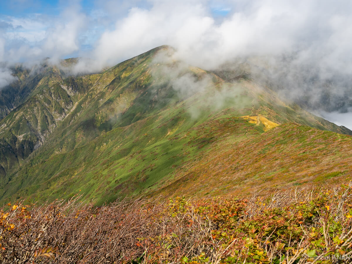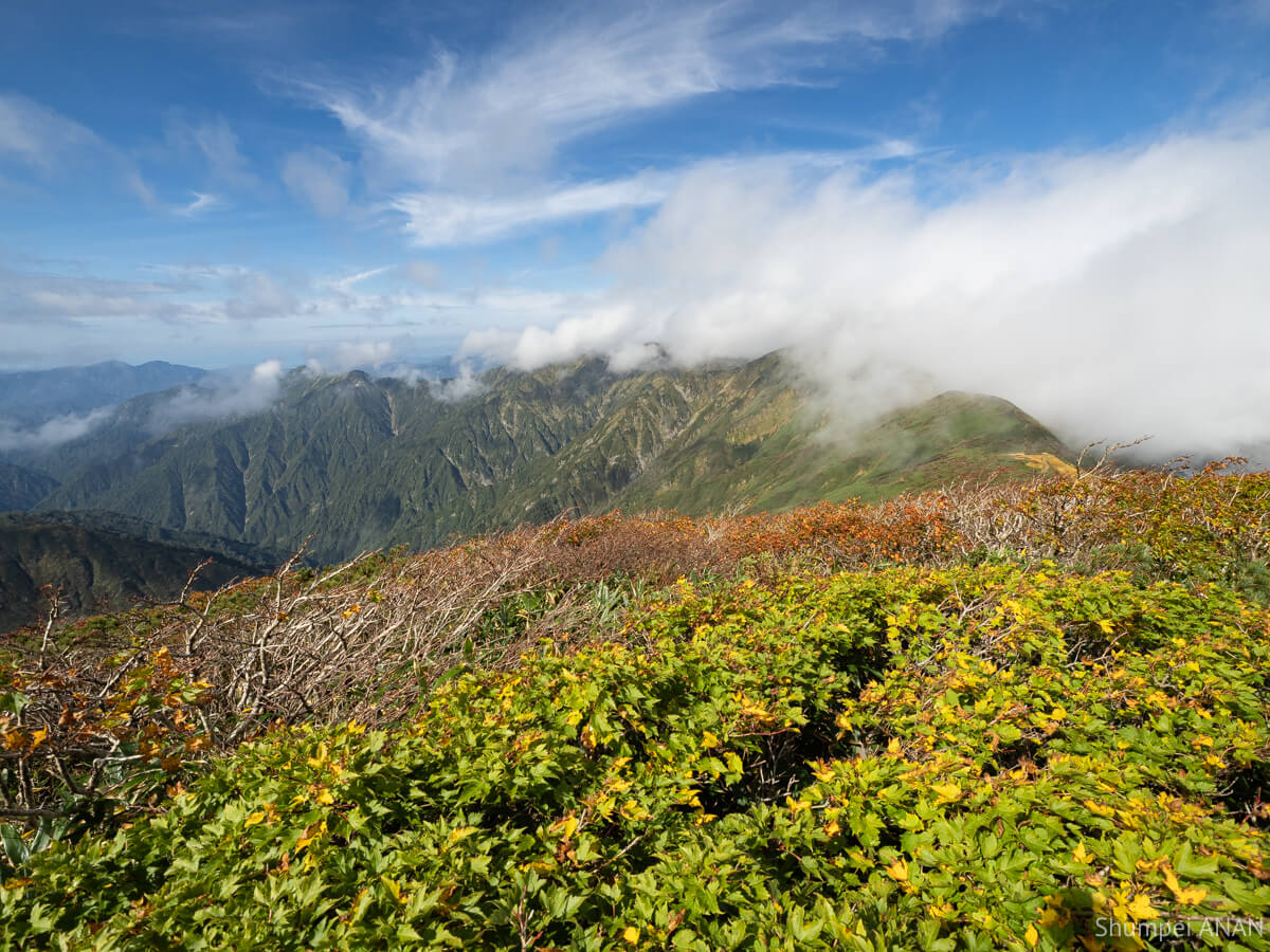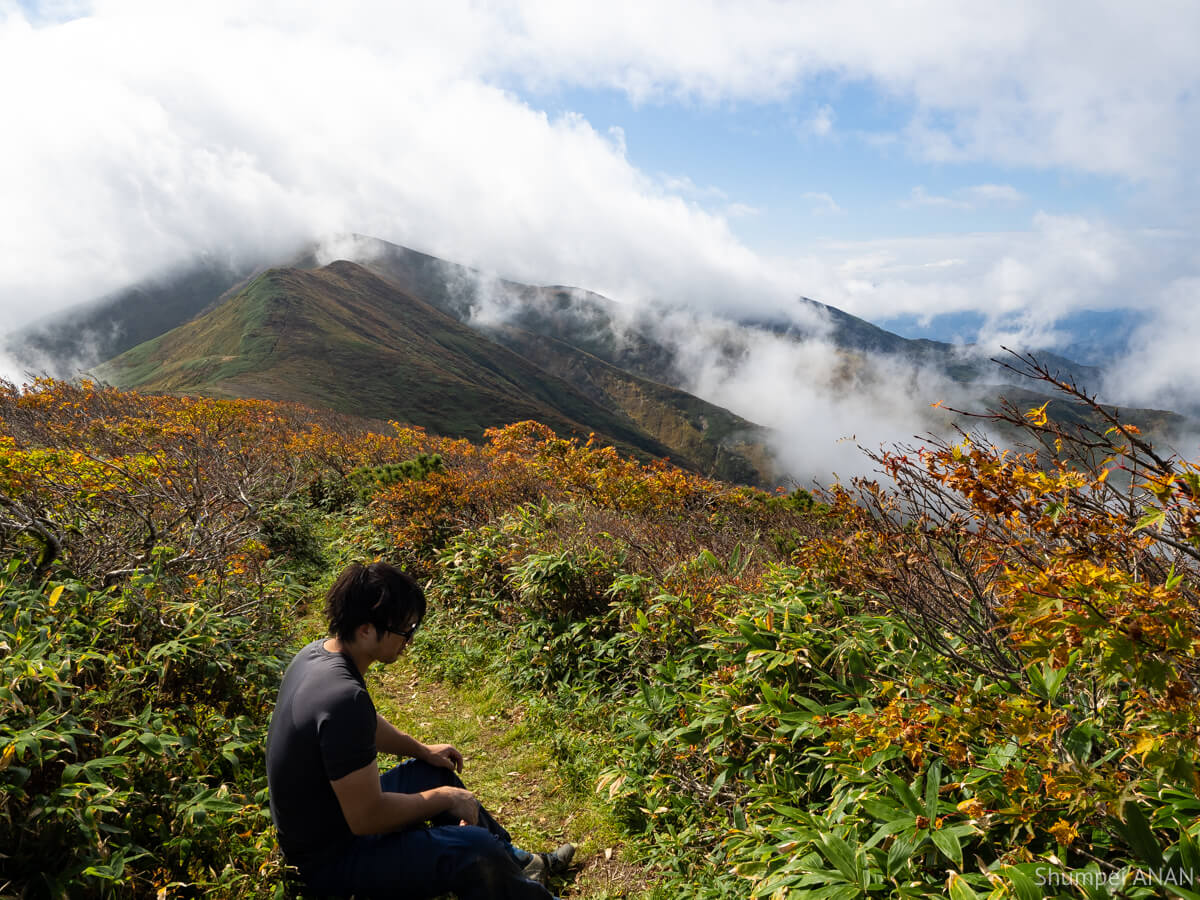 ここから日暮沢小屋までは、朝日主稜線の縦走となるが、ガスの中で涼しく快適なハイク。