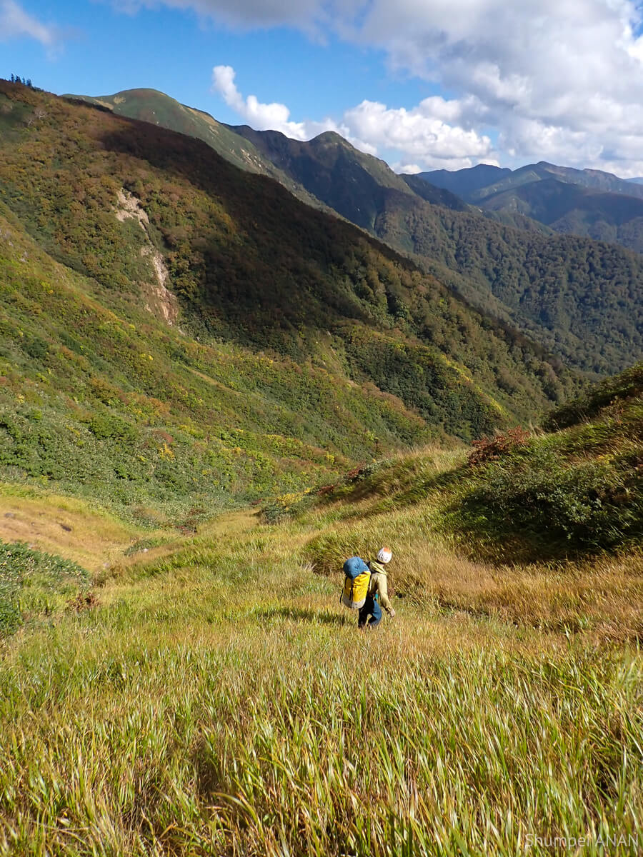 やがて、草原に飛び出した。 去年はここで暴風雪に見舞われて忽ち逃げ帰った。 今は爽やかな秋風が草を揺らし、まるで奥利根が手招いているよう。一歩踏み出し、上ゴトウジ沢の下降に入る。