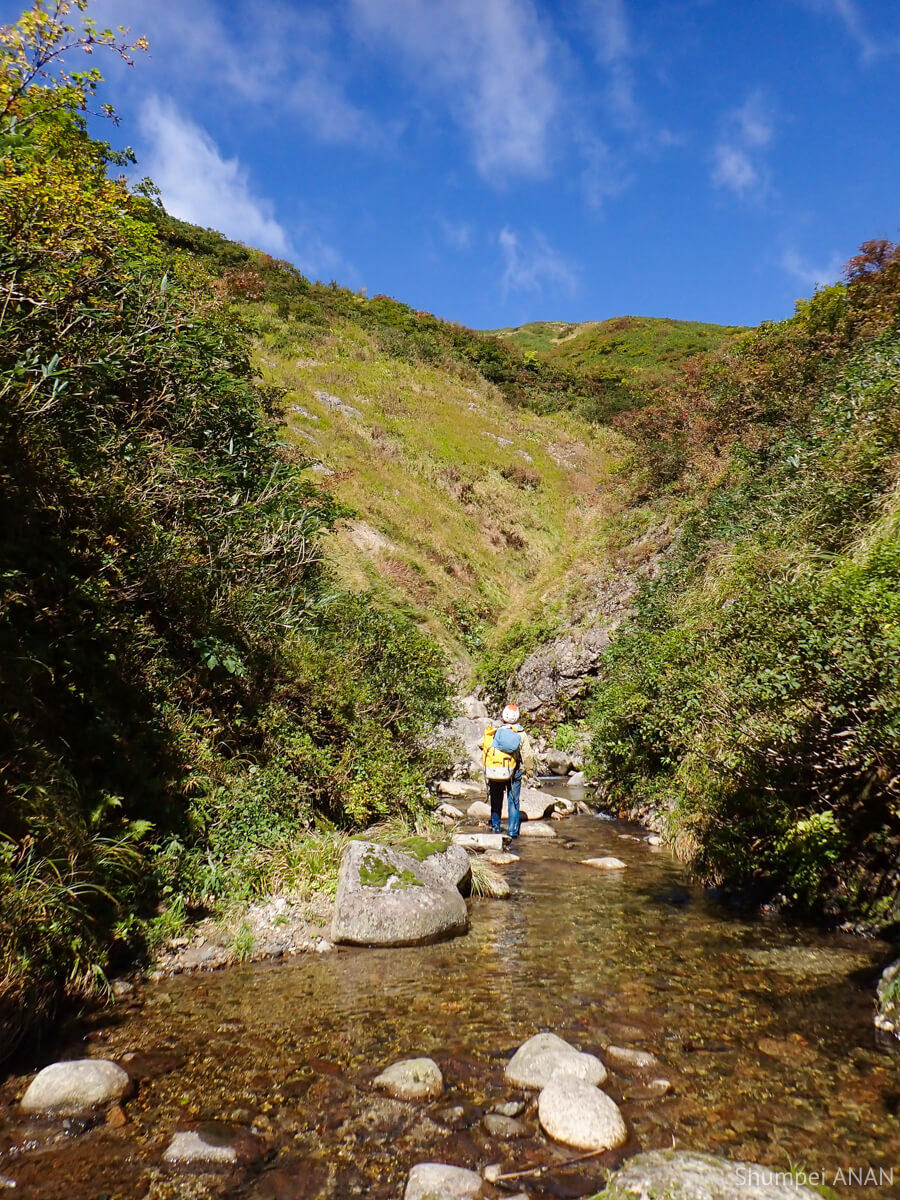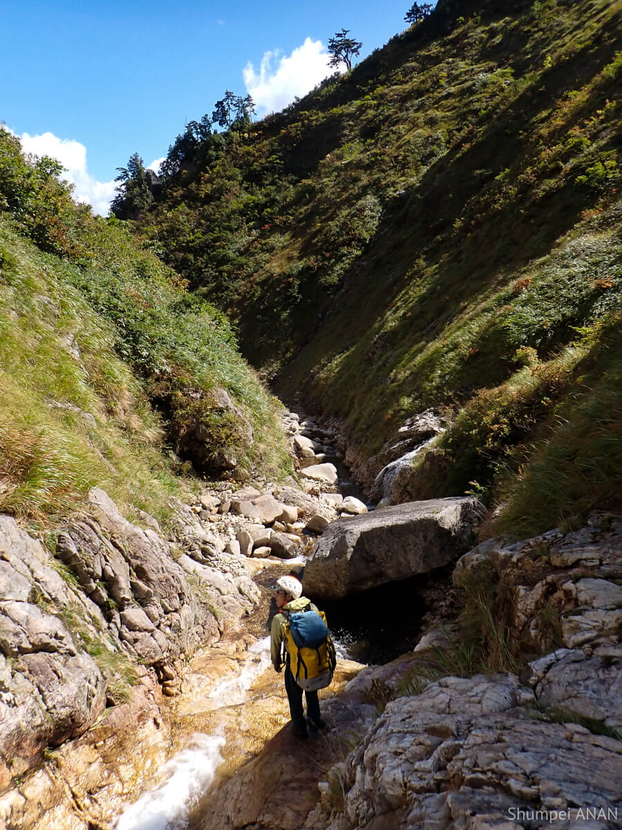 大滝は、沢を少し戻った右岸の岩棚から高巻くことにした。カモシカに見守られ、非常に眺めがよく、爽快な高巻きであった。 大滝の上は途端に源頭らしくなり、いくつかの滝を巻いたり、登ると水流は徐々に細ってきた。