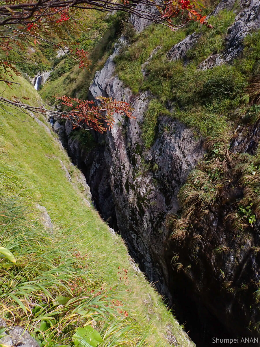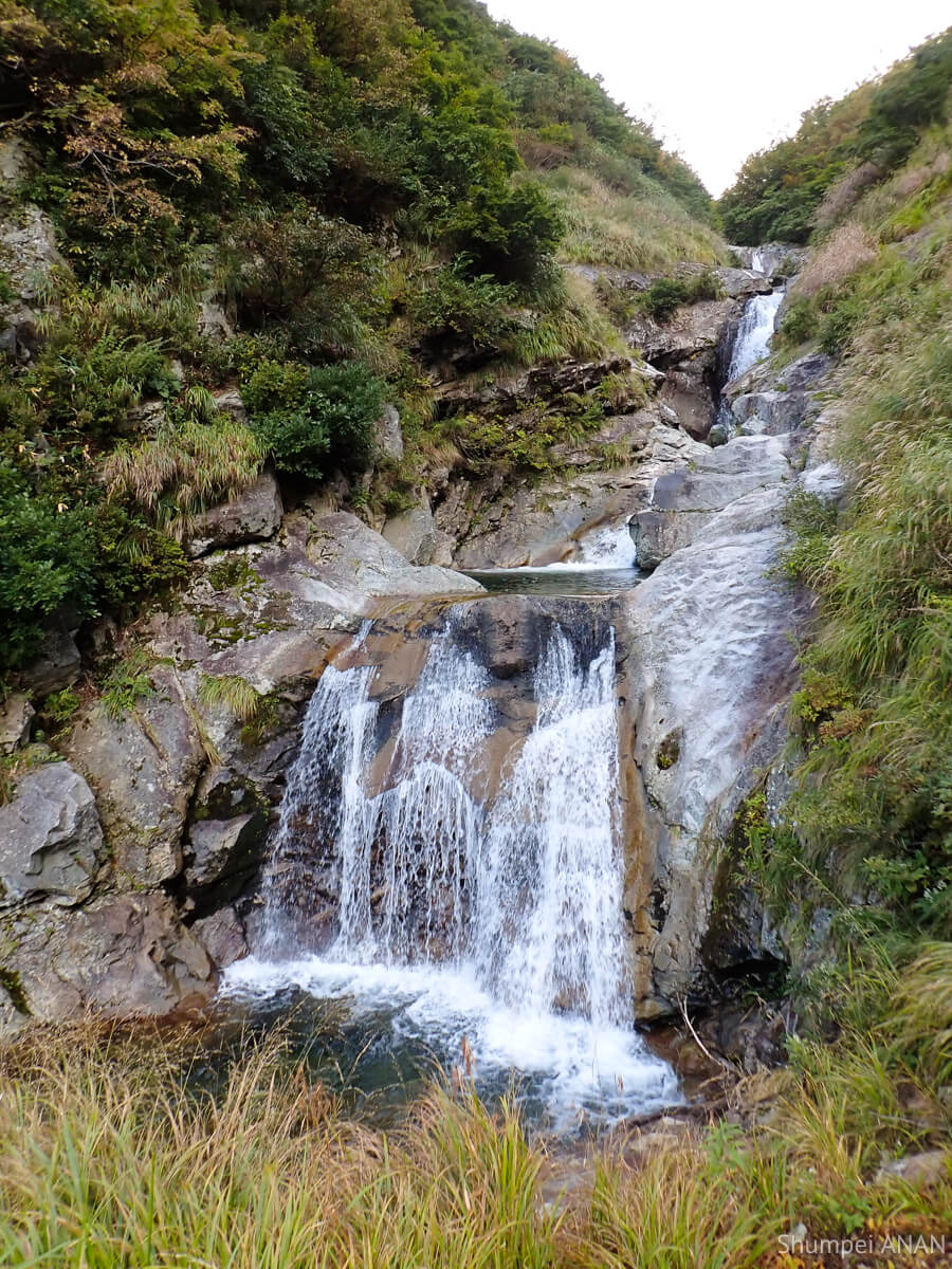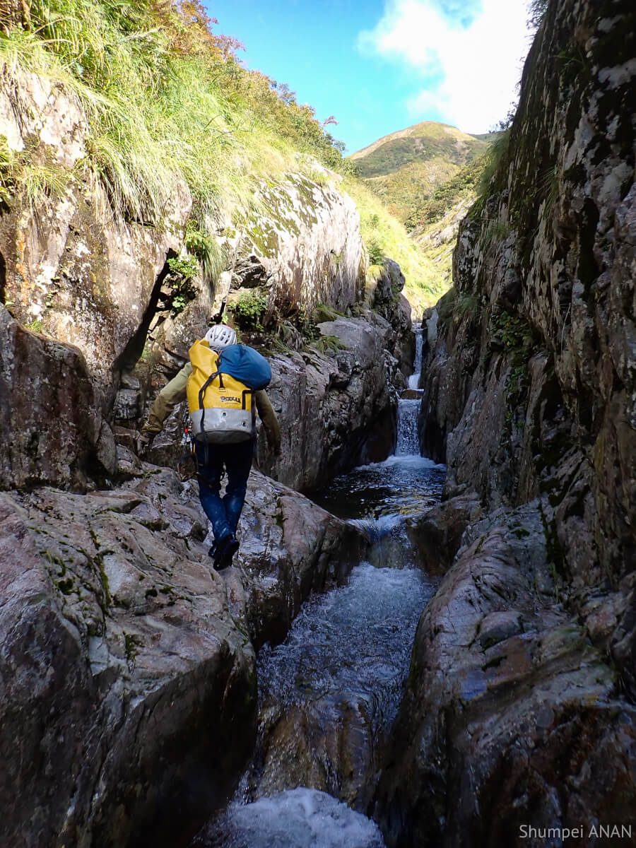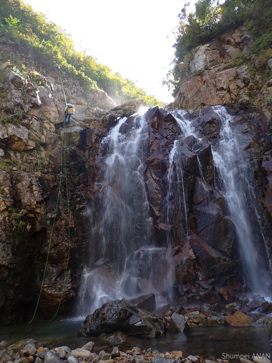 ゴルジュを巻き終えて、先の滝に降りるとき、草つき斜面で中澤さんが10mくらい滑落して落ちてきた。幸いずりずり落ちてきたのでどこも怪我はなかったが、こんなところで怪我でもしようもんなら大変だ。