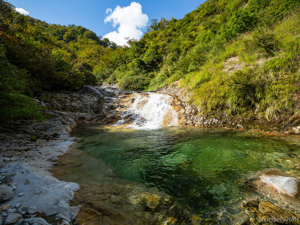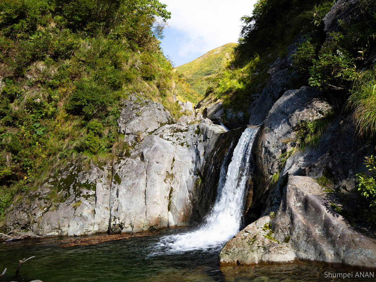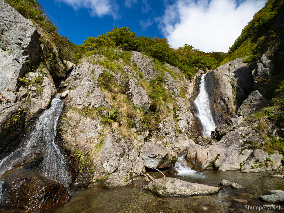 その独特の形とスカッと開けた空間。抜ける青空とマッチしており、素晴らしい奥利根の原風景。 奥利根の秘瀑と対面できて感無量である。