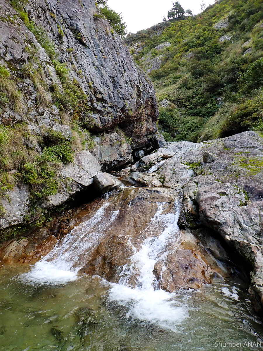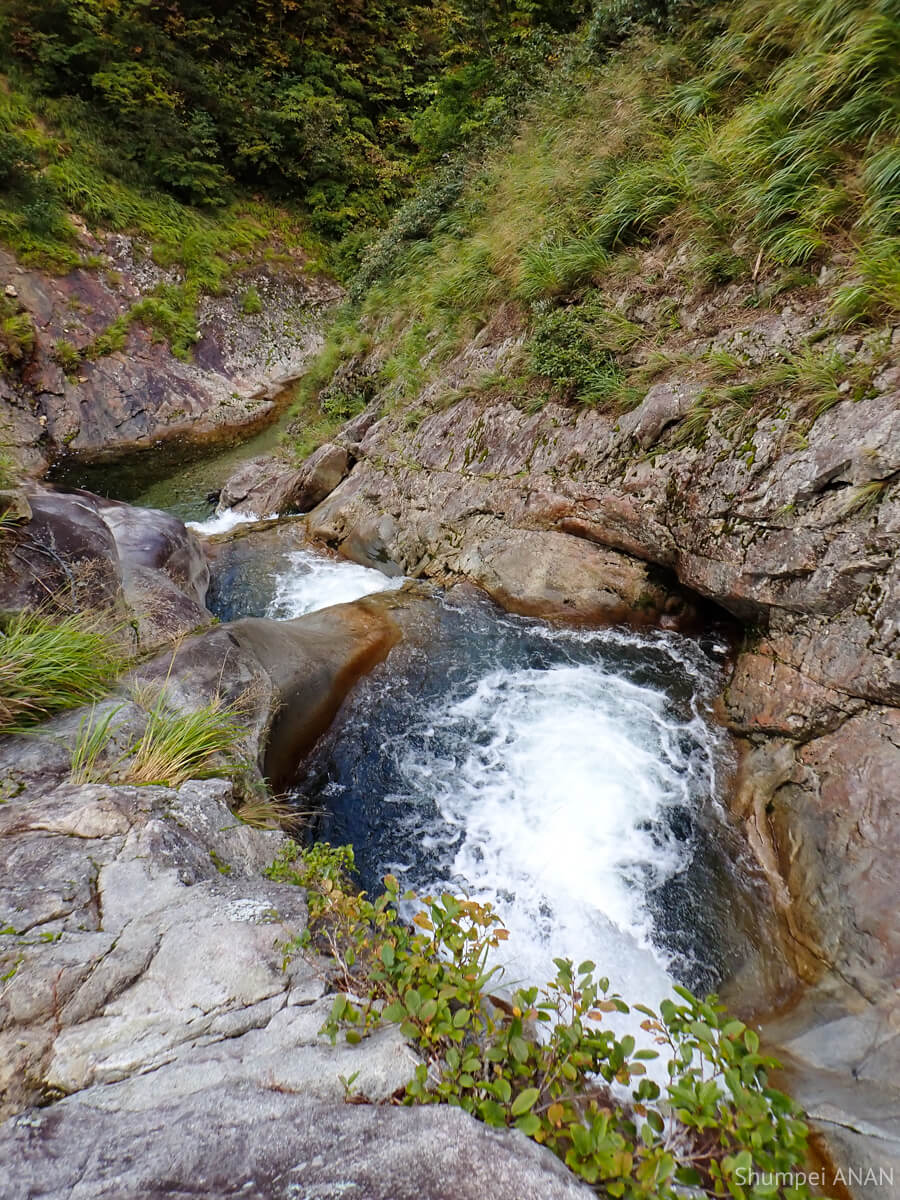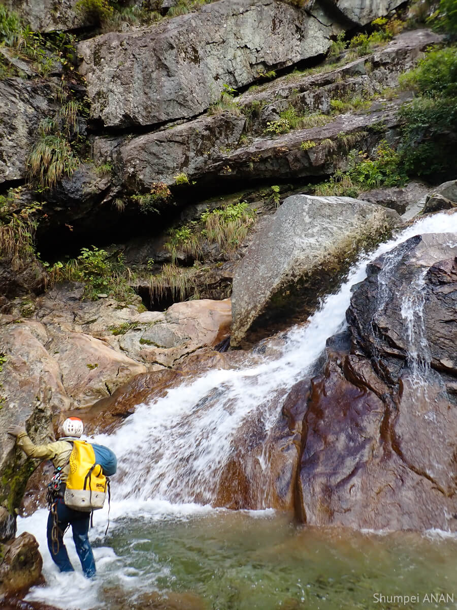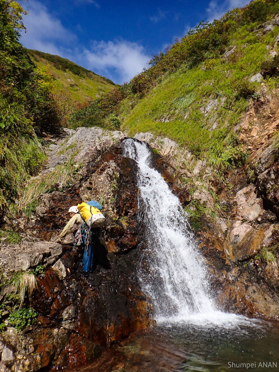 ただ、ツルツルで寄せ付けない連瀑もあり、草つきから巻くこともしばしば。 沢に降りてもぬるぬる。