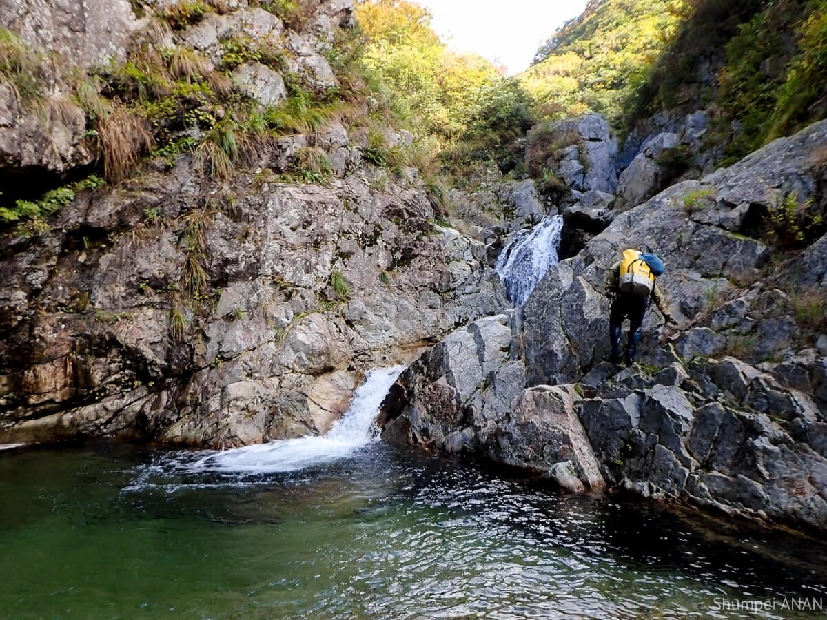 上ゴトウジ沢は概ね下降しやすい沢なのだが、何度か懸垂下降が必要な大きな滝があった。アプローチの沢だが、これとて非常に美しい沢である。