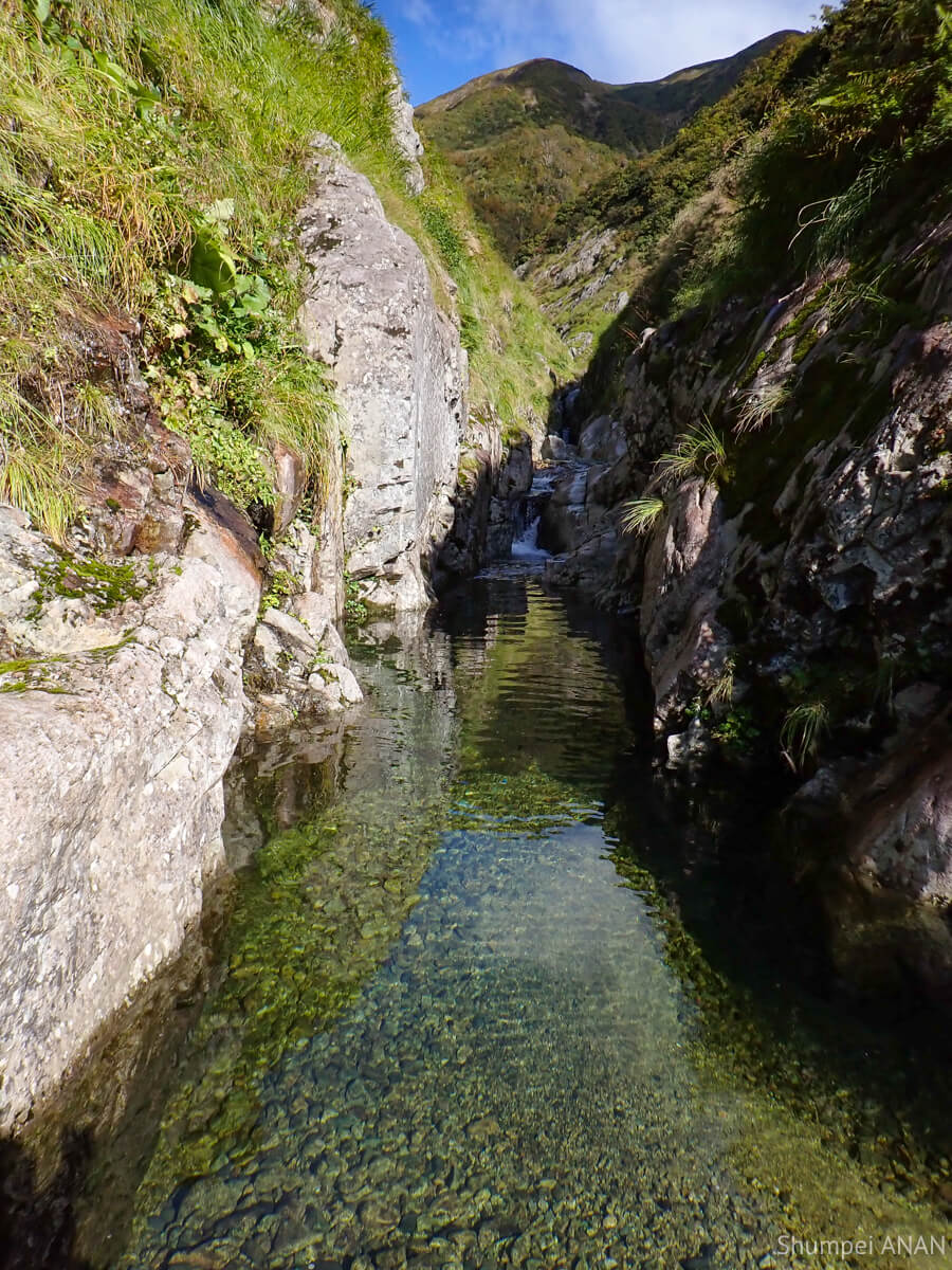 遠くに見える雄大な山々と対比して、なんだかすごく狭いゴルジュへと沢は変貌した。しかし、快晴も手伝って悲壮感ゼロ! ああ、こういうのを求めていたんだ。