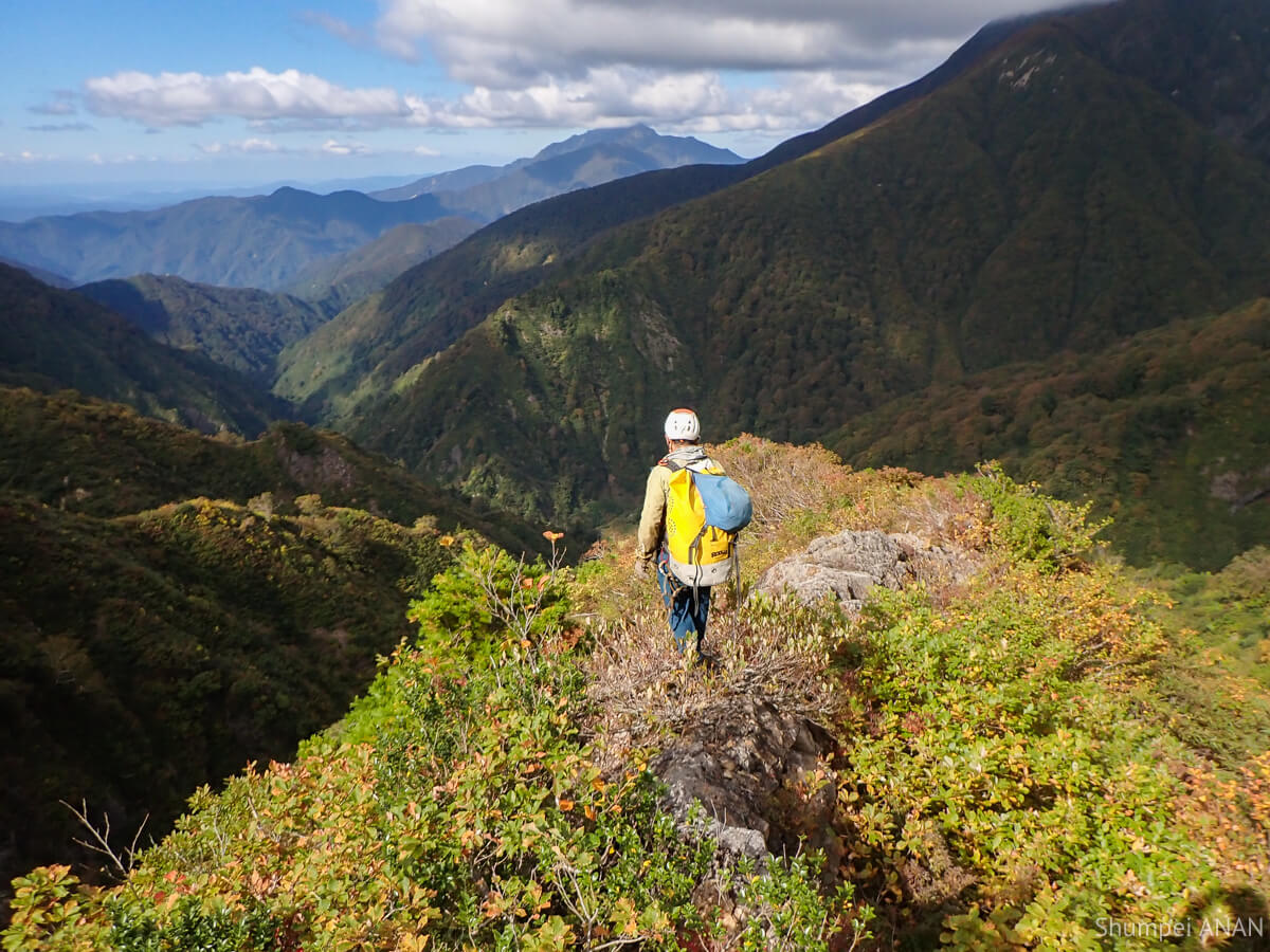 我々はそのまま北側のタマタ沢を下降する気でいたが、少し藪を漕いだ先から見たタマタ沢は非常に険しく、安全に下降できる保証もない。予備日がなく、不確実性のあることは避けたかったため、タマタ沢右岸の尾根から下津川支流の小沢(南沢)を目指した。