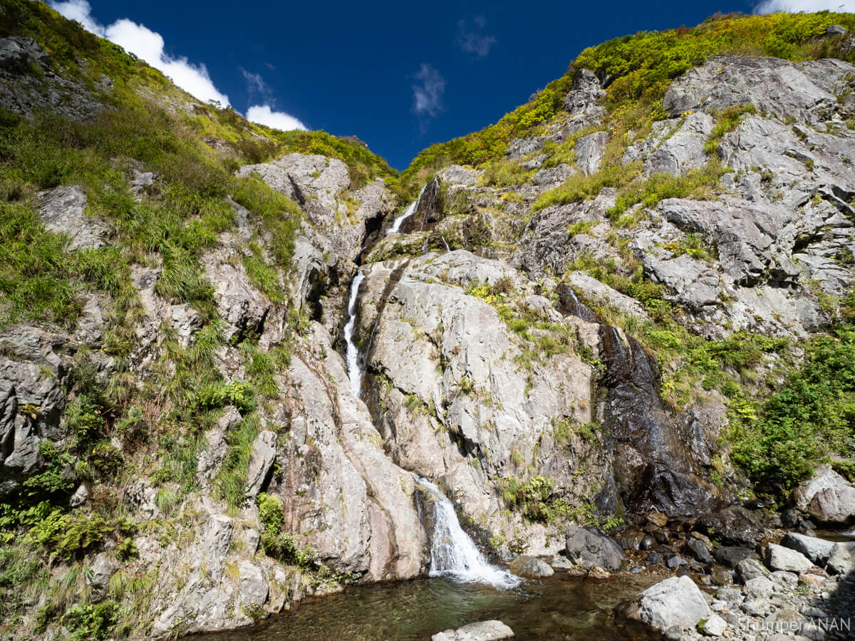 三ツ石沢の大滝は弓形の斜爆であり、溝状に抉られた岩盤を迸る姿が特徴の一本だ。