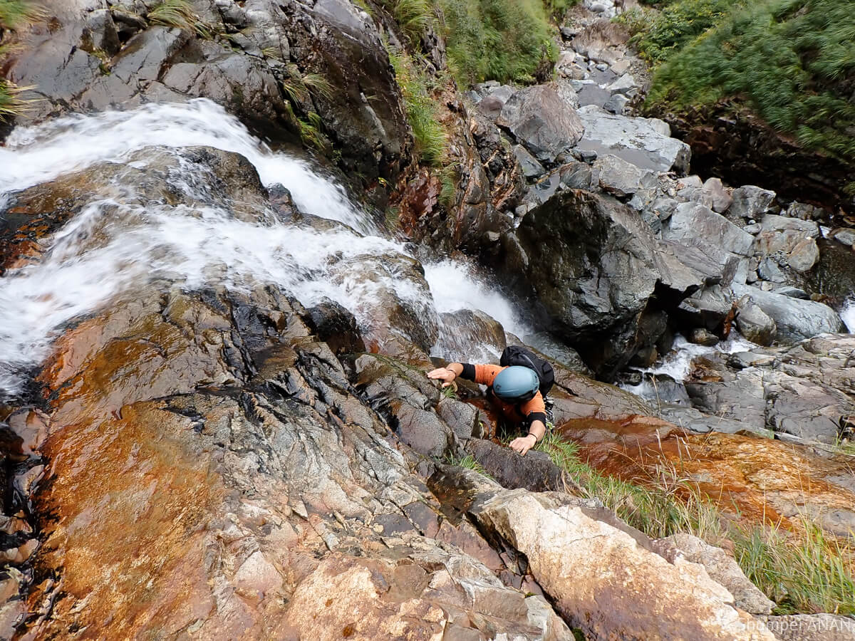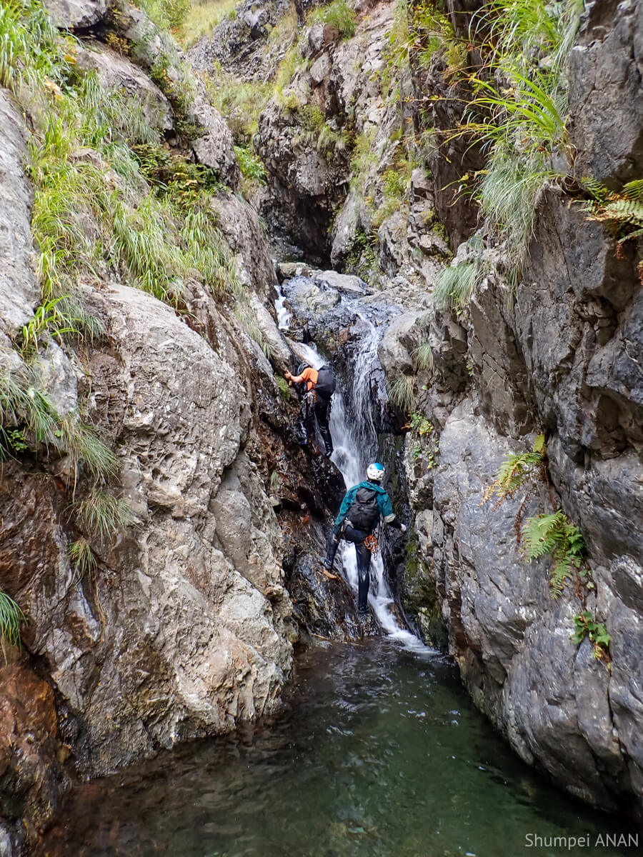 まだ続くんかい!と声に出てしまうほど滝は続く。チムニー状の滝はシャワーからの右壁を行き来して登った。
