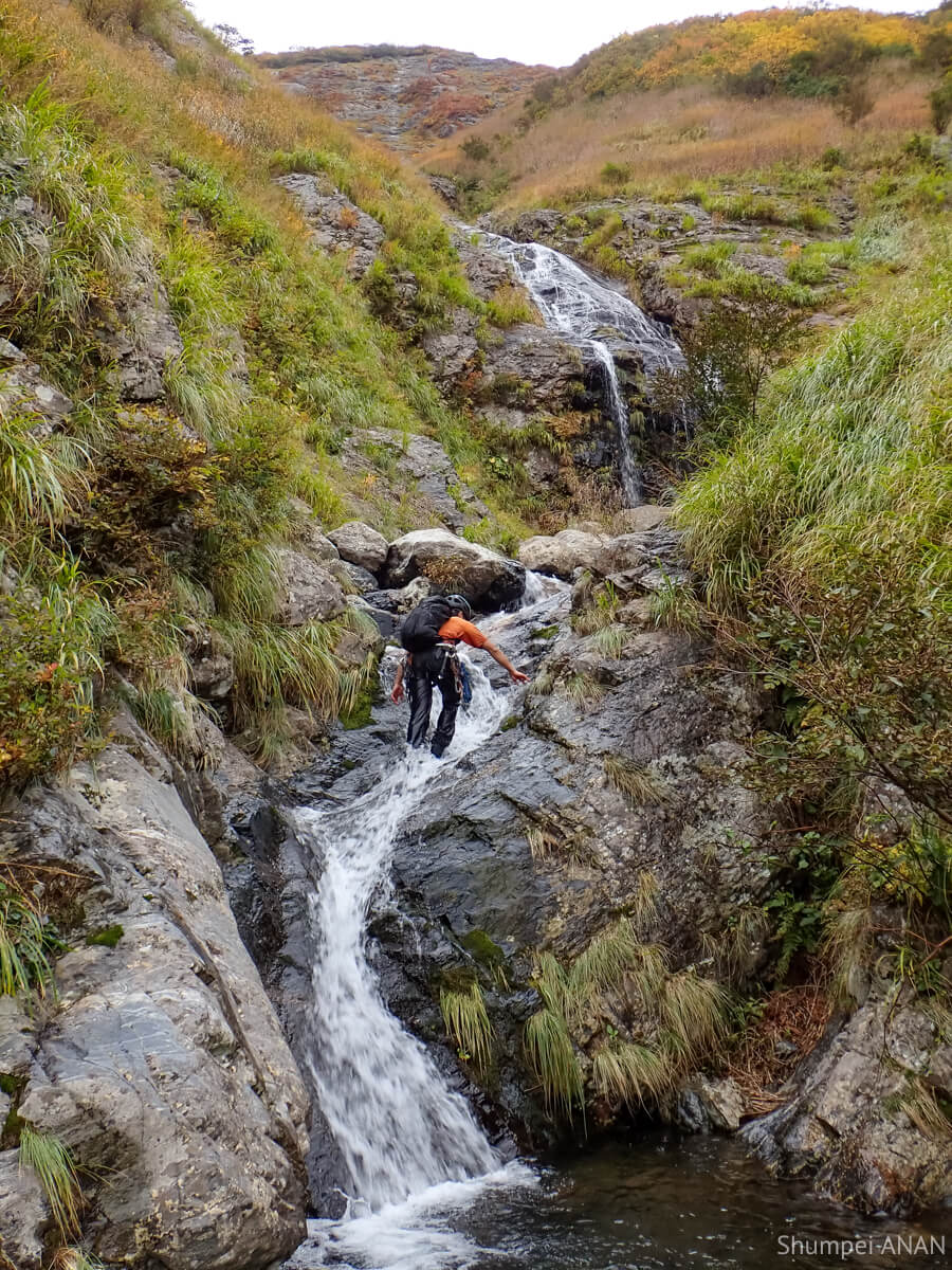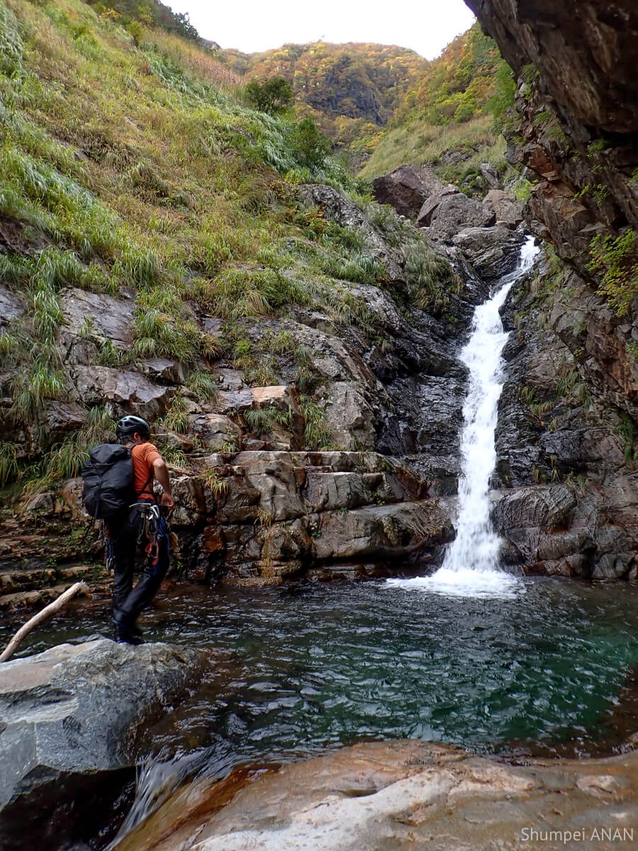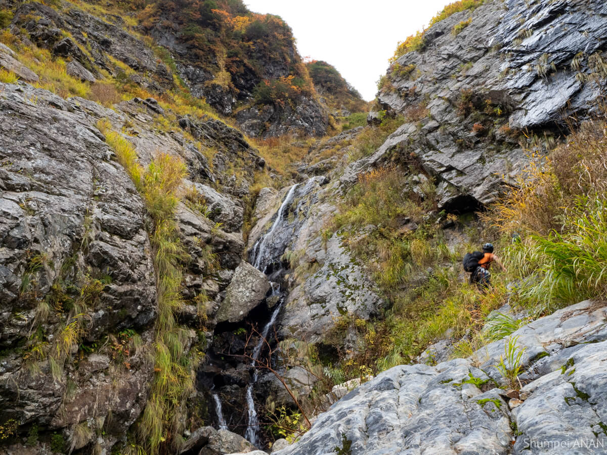 CSの奥にある10m滝は右岸から巻ける地形だが、yamkurumiが果敢にトライ。 もうすぐ11月だというのに布切れみたいなTシャツ一枚で瀑水シャワーを浴びるも虚しく撤退して巻いた。