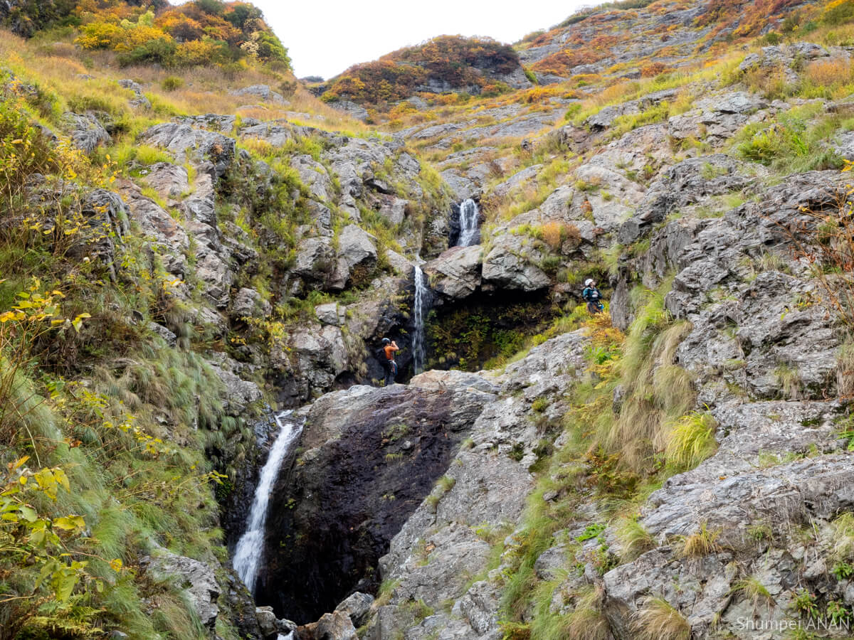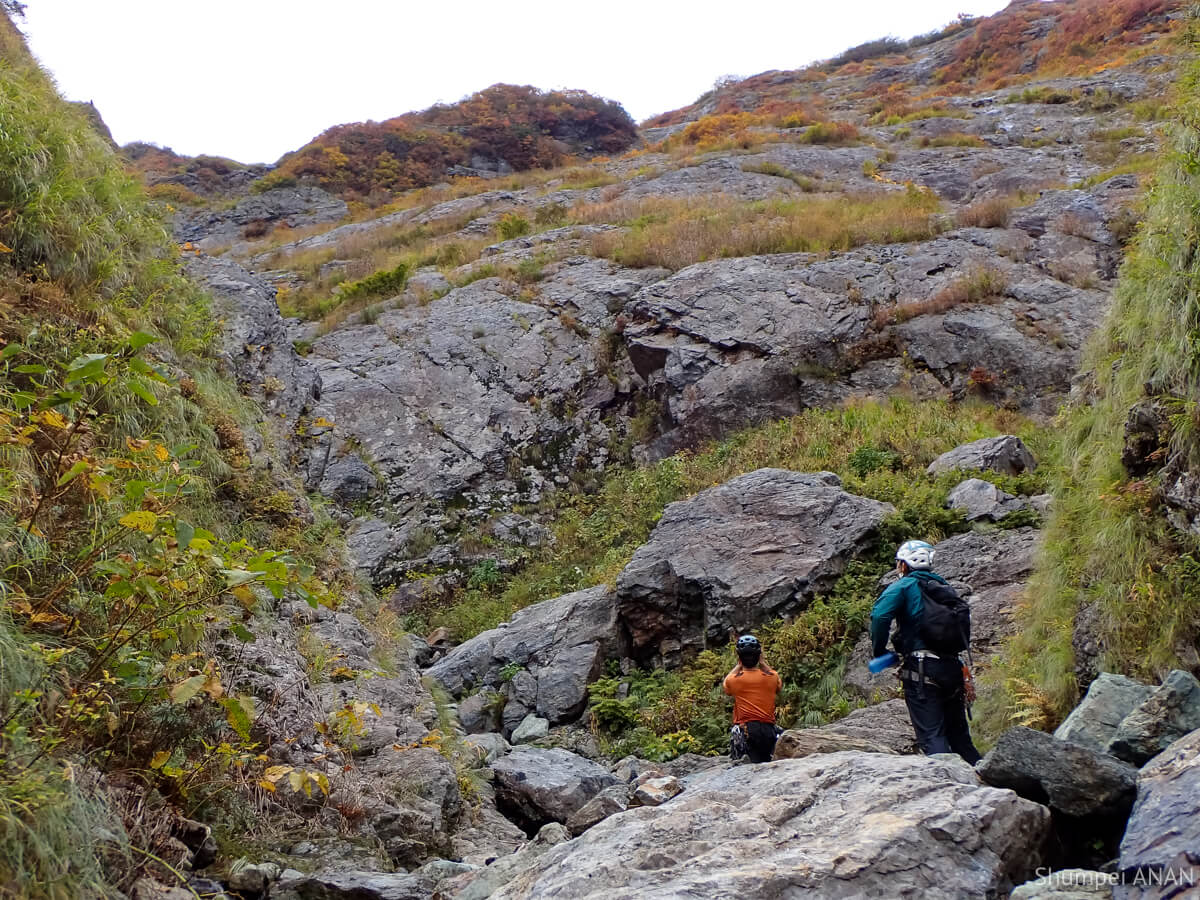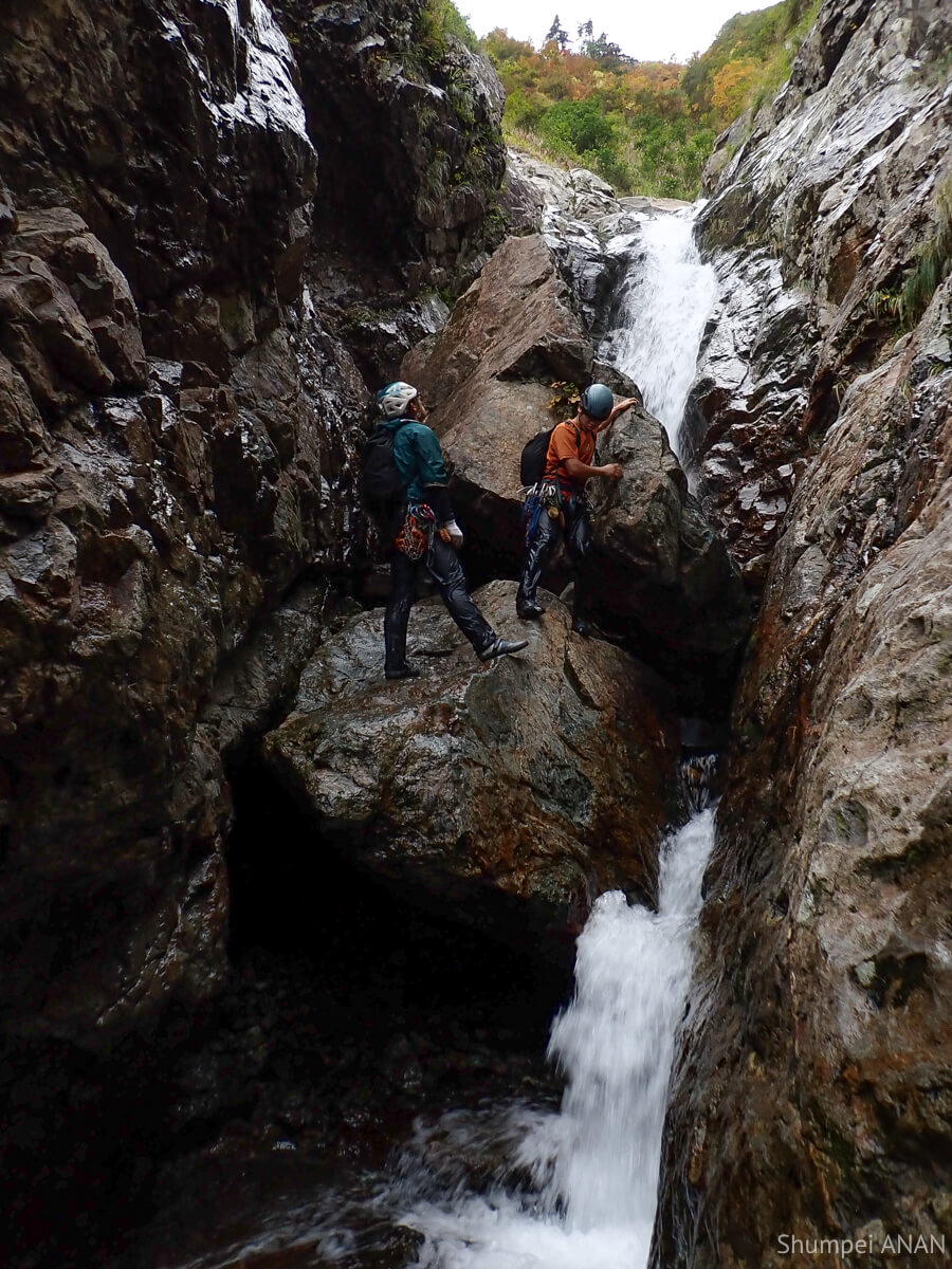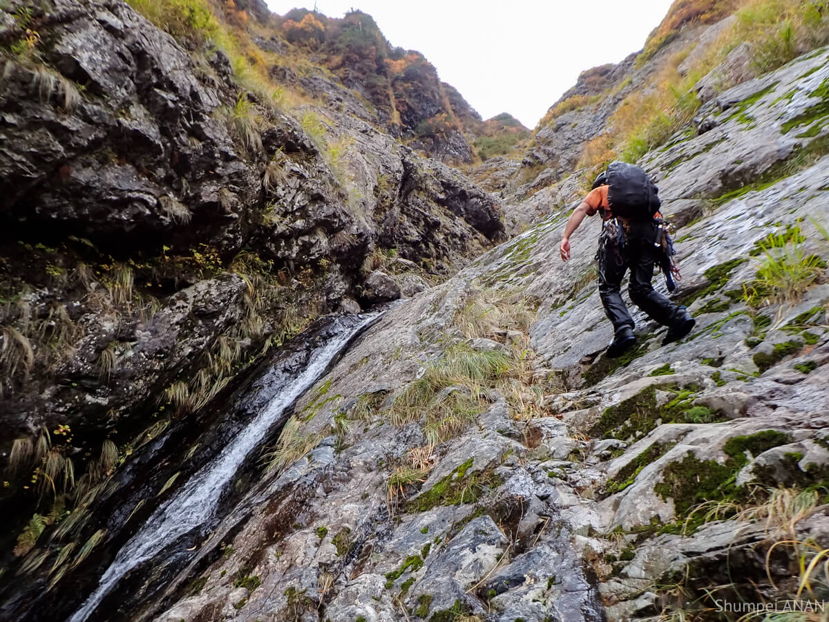 CSの奥にある10m滝は右岸から巻ける地形だが、yamkurumiが果敢にトライ。 もうすぐ11月だというのに布切れみたいなTシャツ一枚で瀑水シャワーを浴びるも虚しく撤退して巻いた。