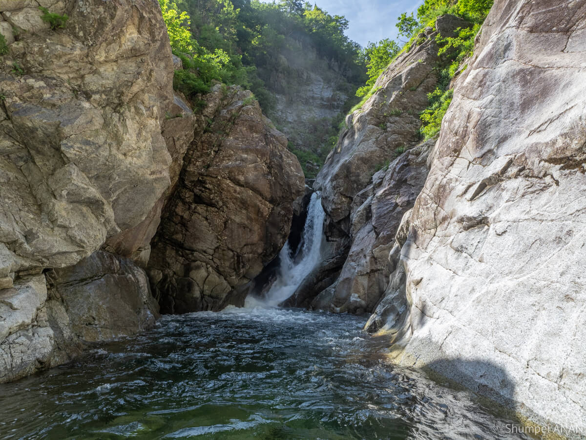 釜滝の先は落ち着くが、30分も歩けば旧魚止滝ゴルジュになる。 大きな釜に噴き出す旧魚止滝は左岸のルンゼから巻く。すると、すぐ上に15mはあろう直瀑がかかっており見事なゴルジュとなっている。