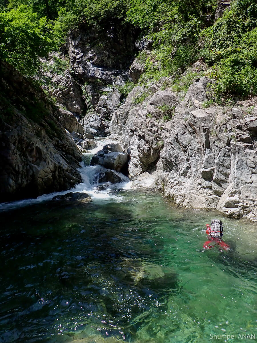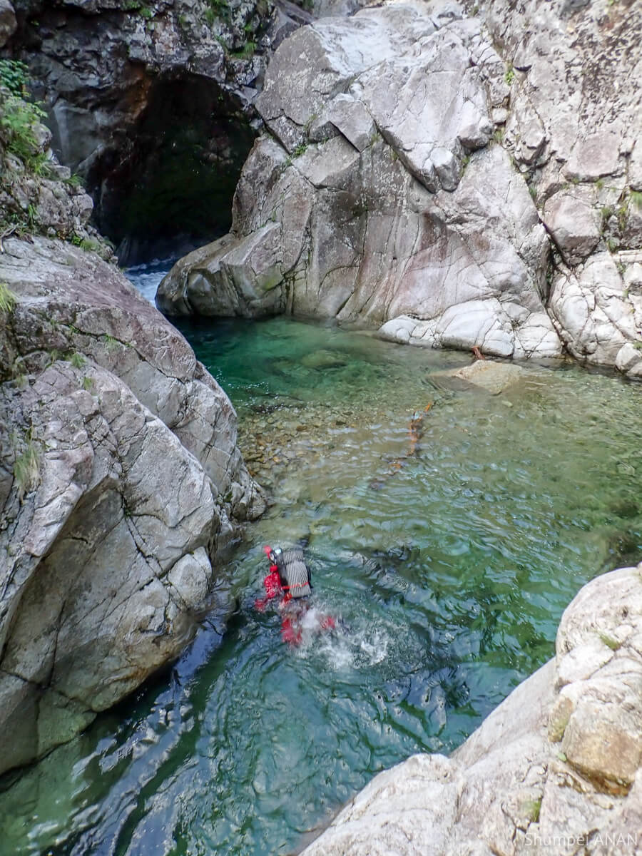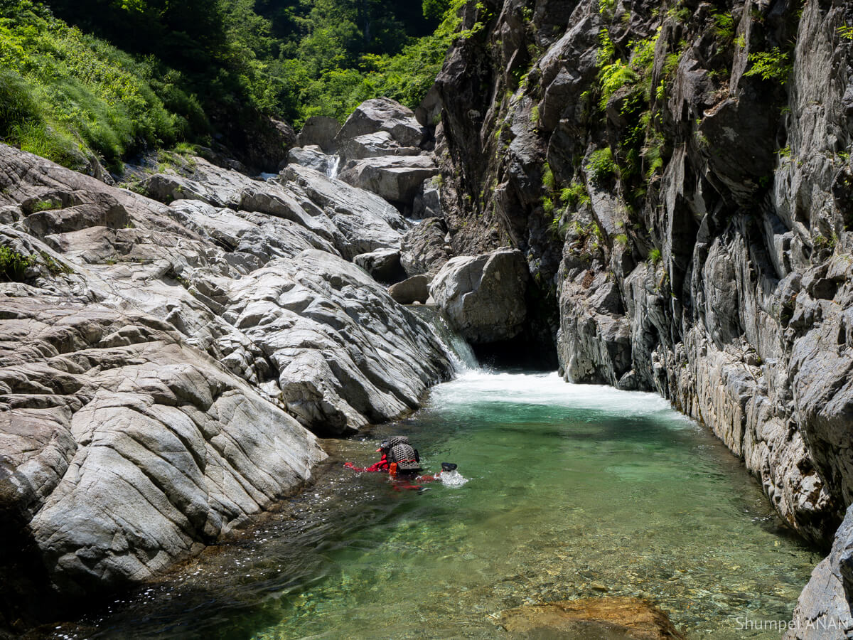 朝日の沢よろしく、めちゃくちゃ水が綺麗! じゃぶじゃぶと浸かり、時には泳ぎを交えて快適遡行だ!