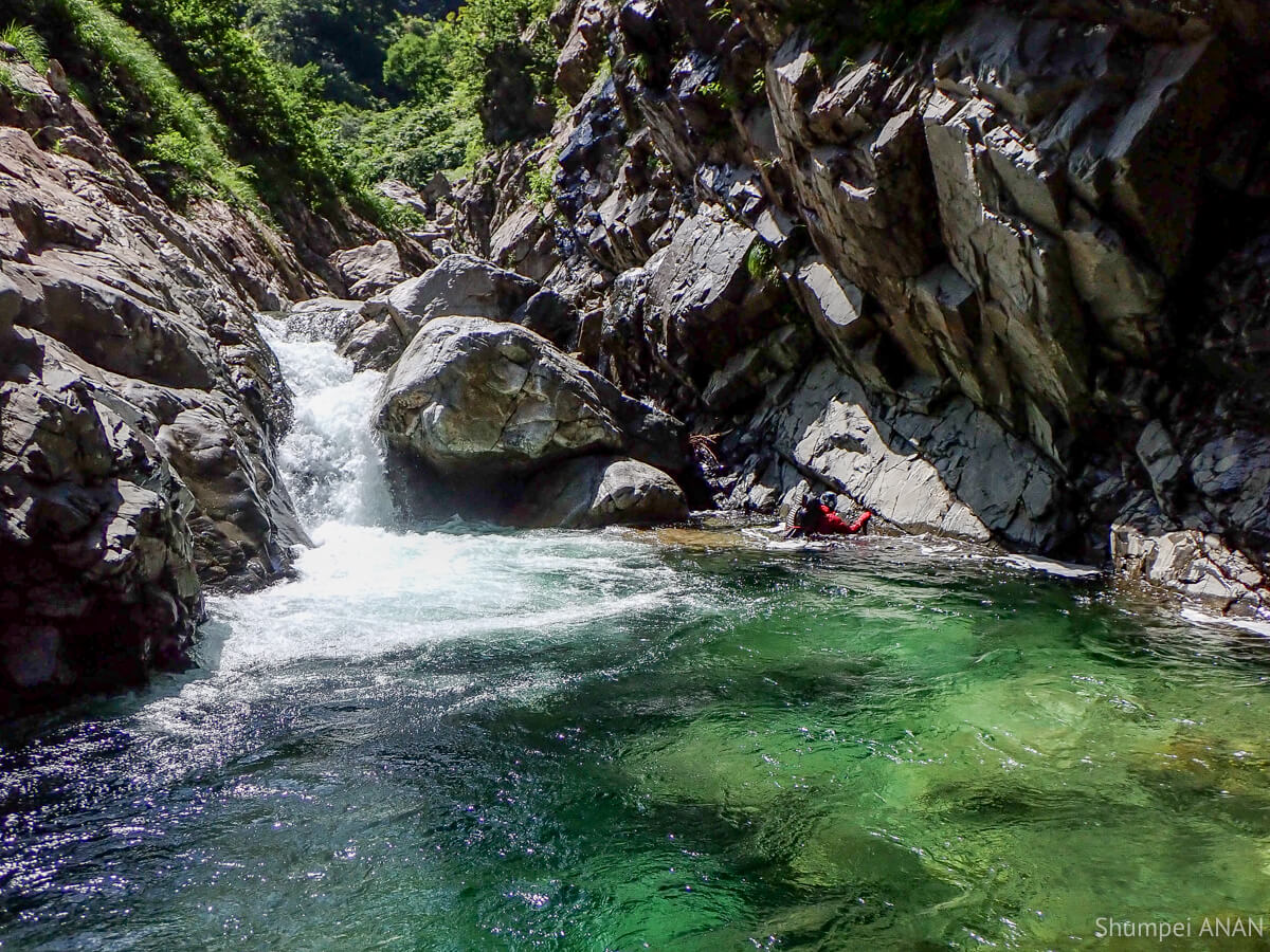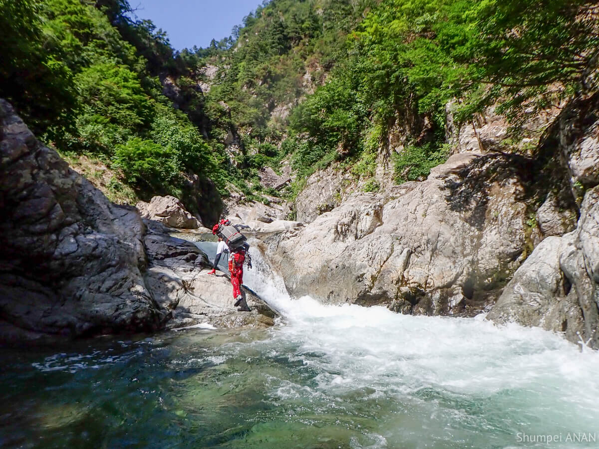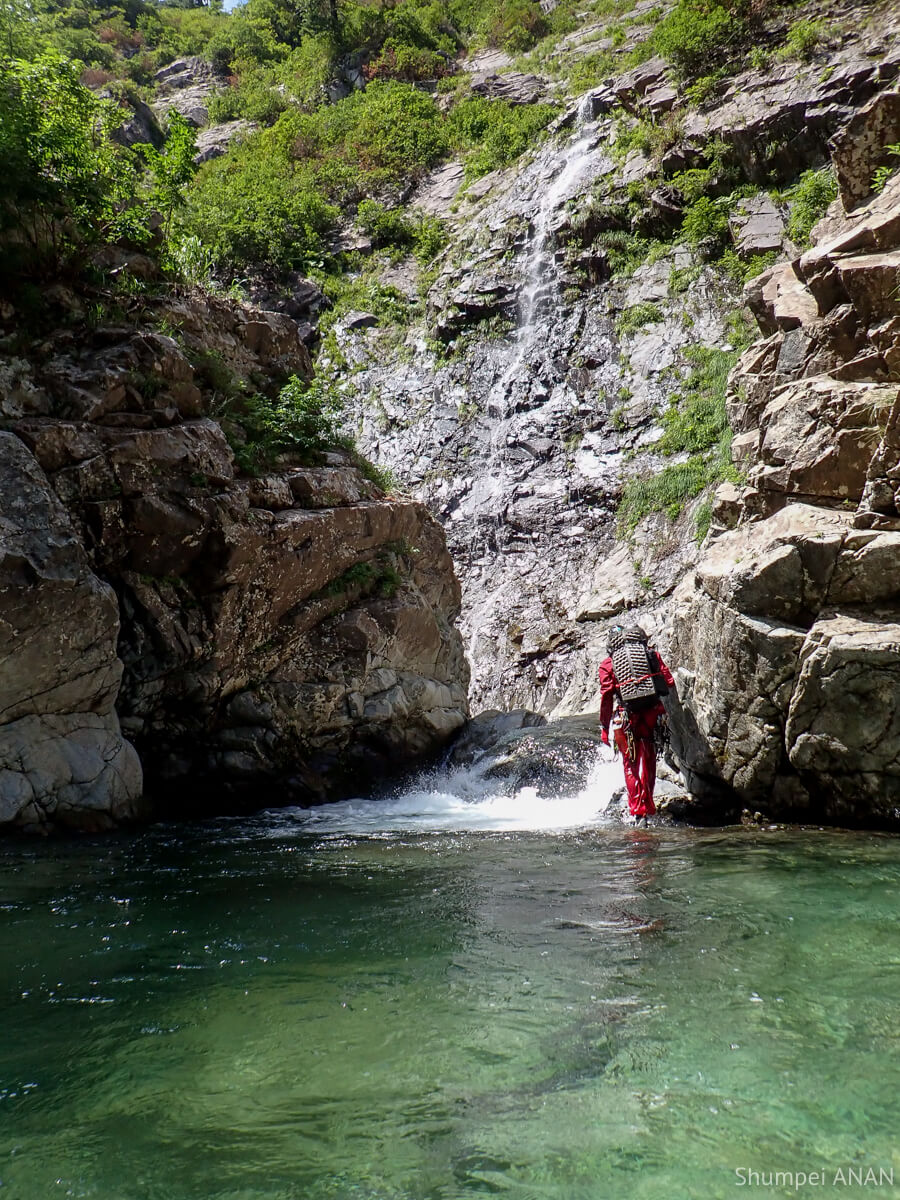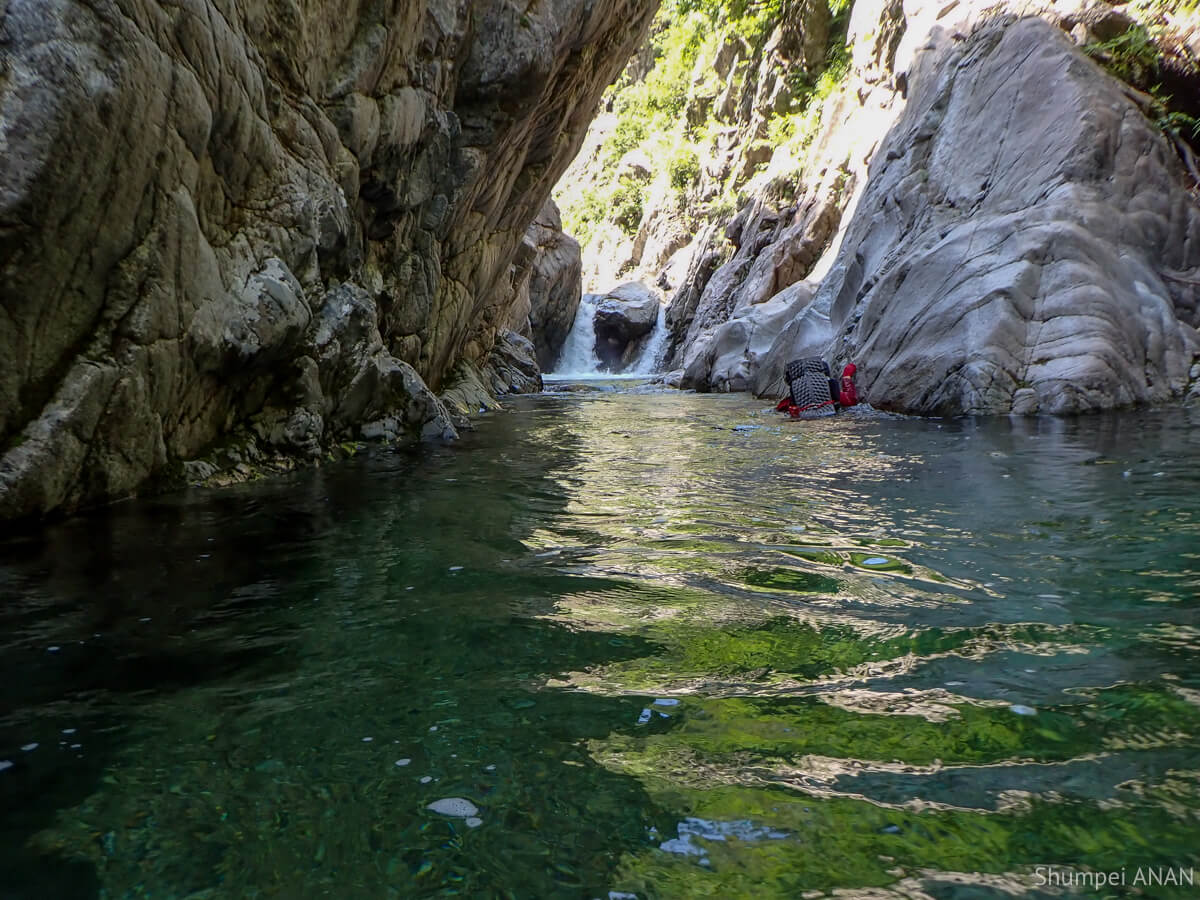 灌木と草付きの左岸トラバースを終えると水線を進める楽しいゴルジュステージ。