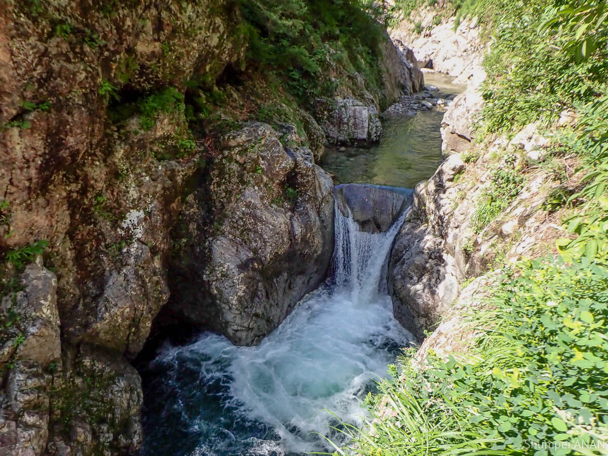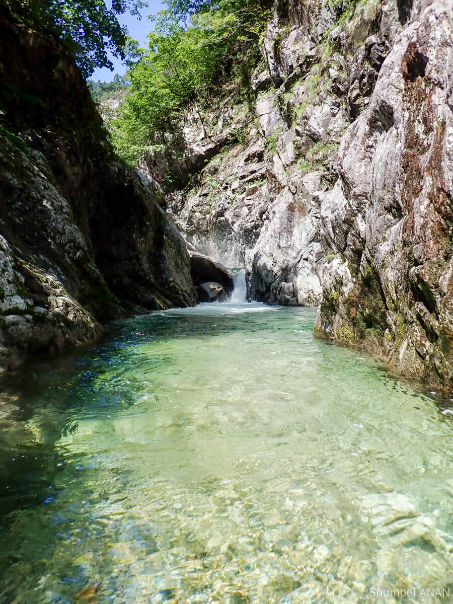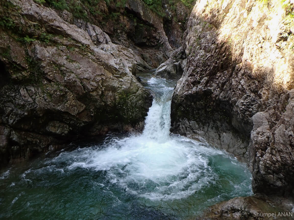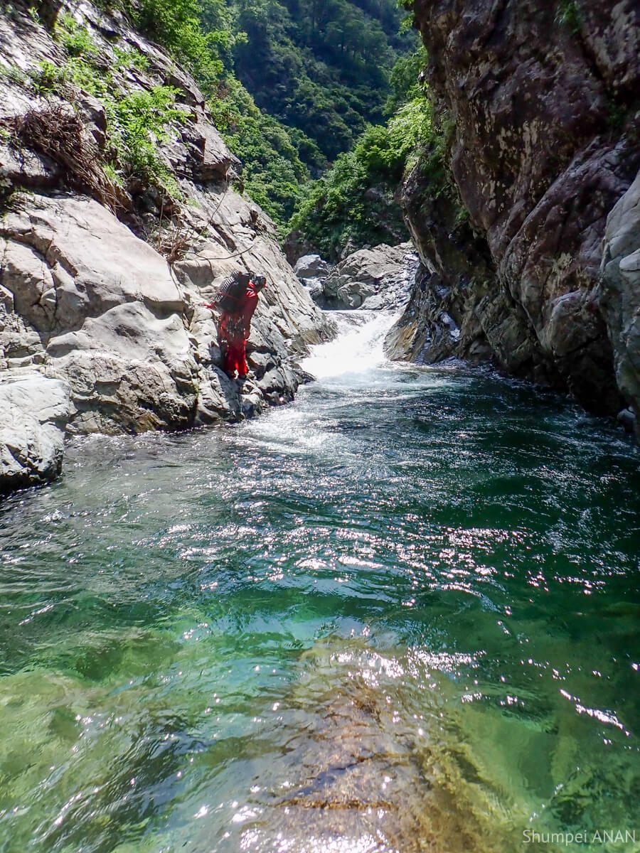 灌木と草付きの左岸トラバースを終えると水線を進める楽しいゴルジュステージ。