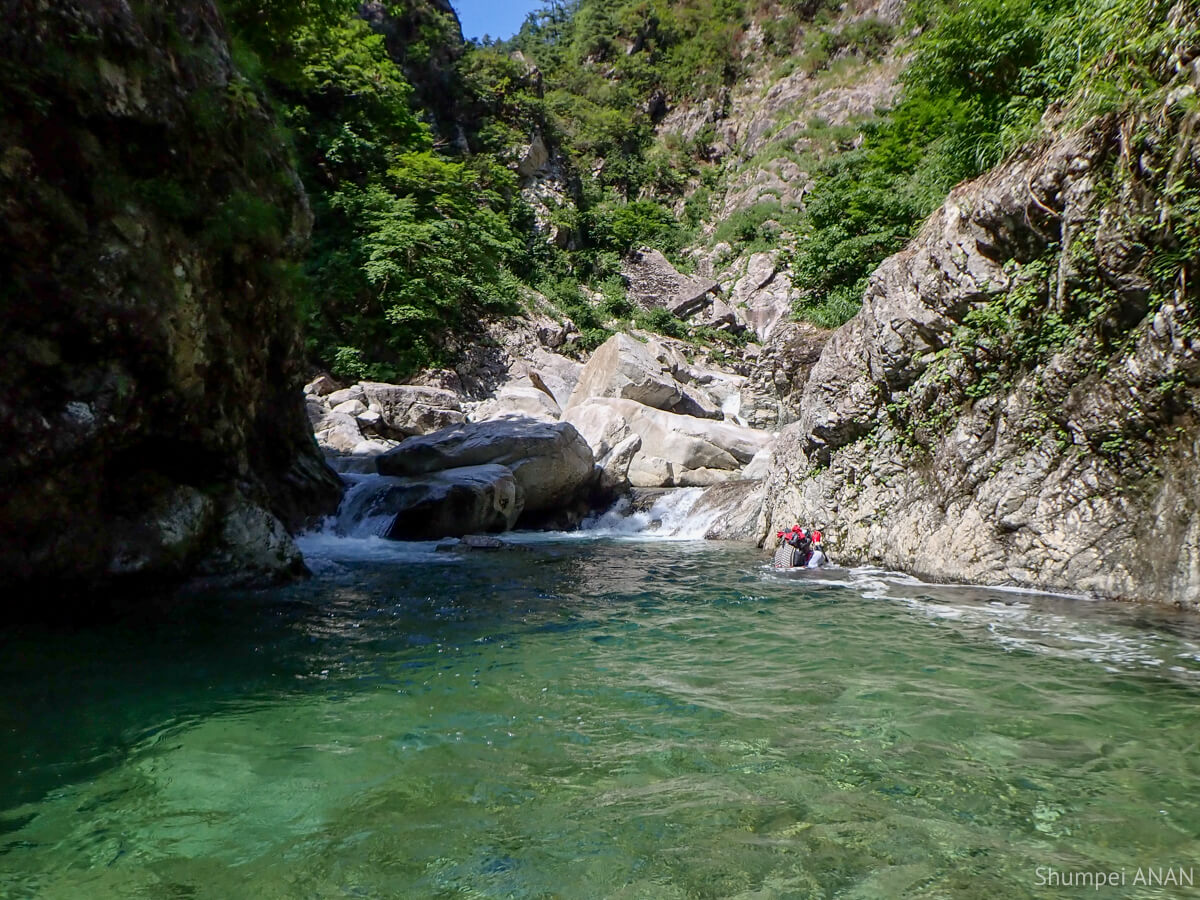 右岸トラバースから細流を横断すると、すんなりとツバクロダイゼンの上に降り立つ。最後は2m滝を一泳ぎで超えると、沢は一気に開け太陽が燦々と注いでいる。 どうやら全ての難所を超えたようだ!