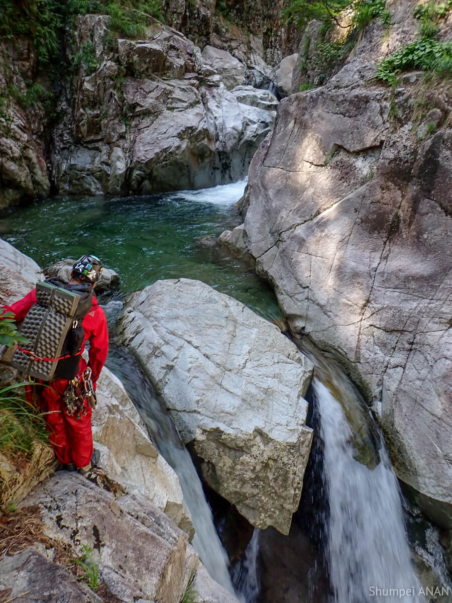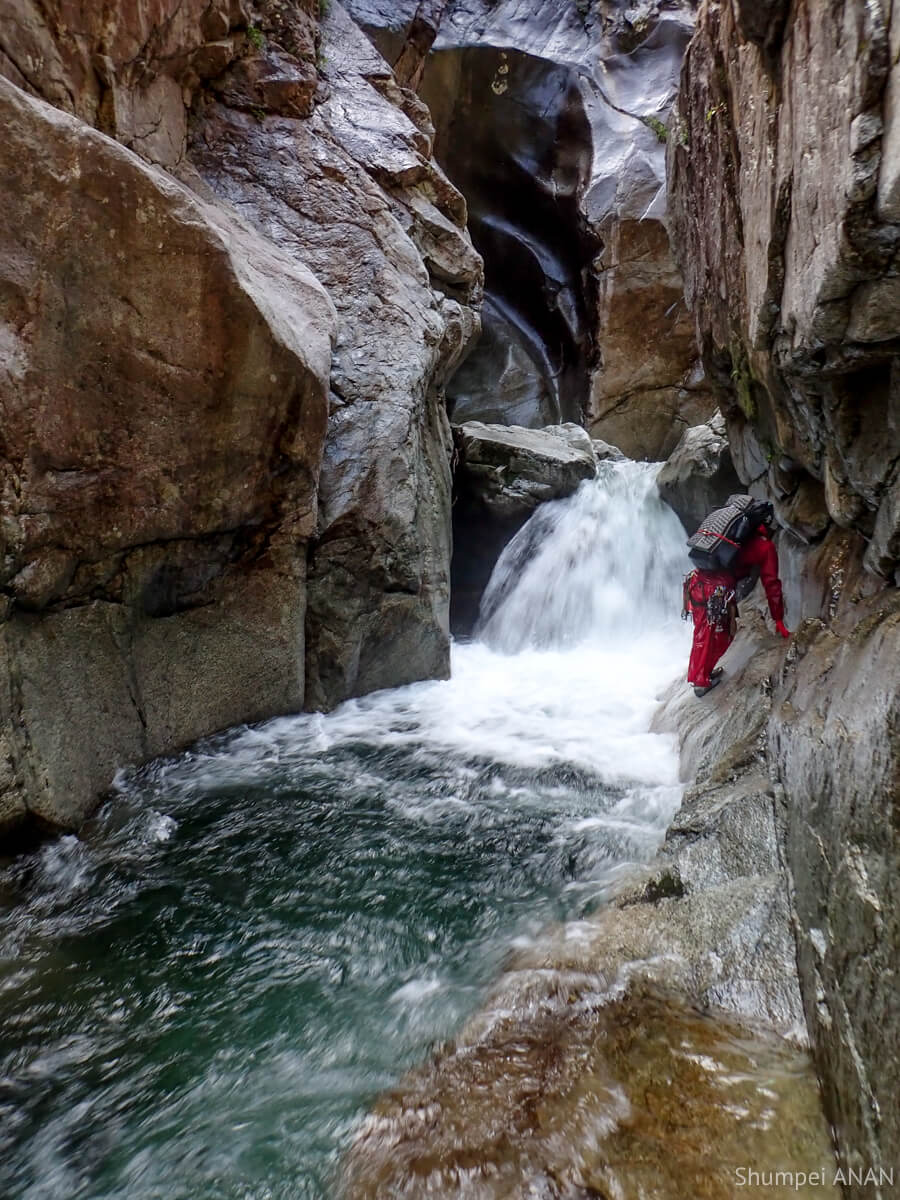 ちょっとした河原を挟むと明らかに険しいゴルジュ、CS3m滝は瀑水の右からカムをセットして奮闘したり、空身で挑むもうまくいかない。