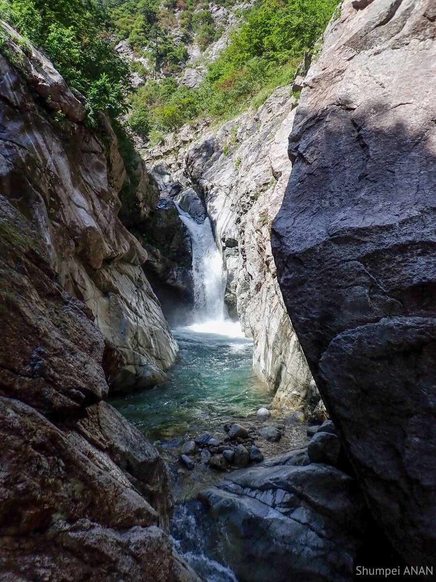 2段7m滝を超えると、奥に異様な岩壁が見え隠れ。いよいよツバクロダイゼンとご対面。