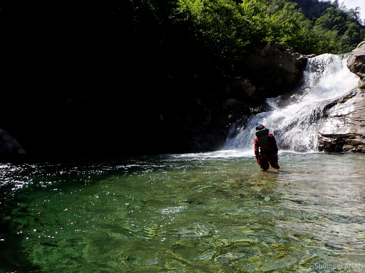 西ノ俣沢は険しいゴルジュのルーファイが鍵となる沢だが、眼が眩むほど明るい名渓だ。ゴルジュと上部の穏やかな渓相のコントラストが素晴らしい。 今回のような一泊ショートコースも気軽でいいが、化穴山を踏んだ遡下降で繋げばより真価を増すことだろう。何にしても素晴らしい沢ですわ!