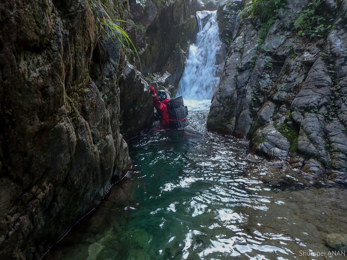 …ゴーロを歩くと早速ゴルジュっぽくなり、豊富な水量に負けじと進む。 左岸に大きな甌穴を持つ釜滝は泳いで取り付くもなすすべなく、右岸の灌木のある岩盤から巻く。モーリーさんがフリーで取りついていたが、めちゃくちゃ悪いそうなのでロープをな結んでもらう。フォローで続くとやっぱりめちゃくちゃ悪い。Ⅴ級くらいあるかも。