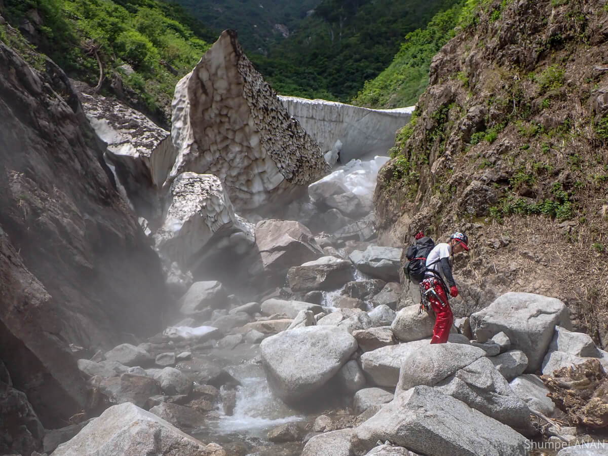 左岸の草付きをトラバースし、滝で注ぐ支流の傍から懸垂下降で崩壊中の雪渓末端に降り立つ。