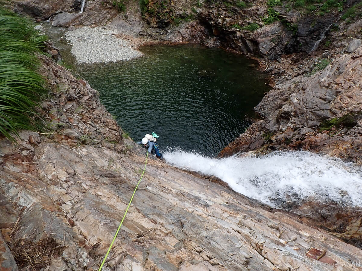 ドウドウセンの門番滝は右から登って、ドウドウセンG滝とご対面。堅固な岩盤を断ち割るような姿で、結構デカくてかっこいい!