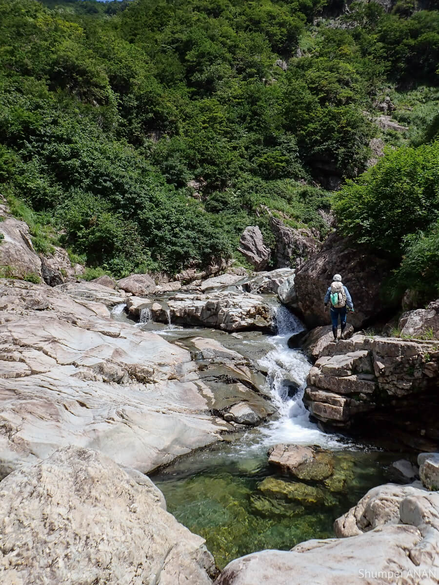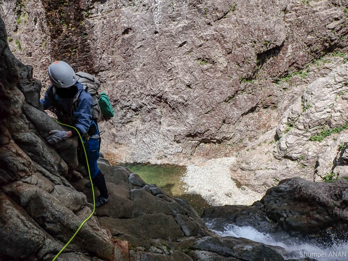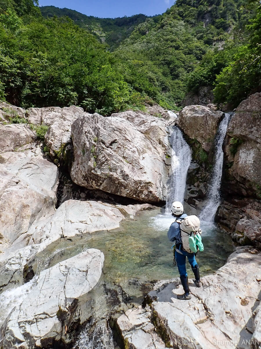 穏やかな渓相の中にかかる6m滝は右岸からへつって超えるが、これが微妙に難しく、江戸切子さんは迷いなく泳いで滝を真正面から登っていたw