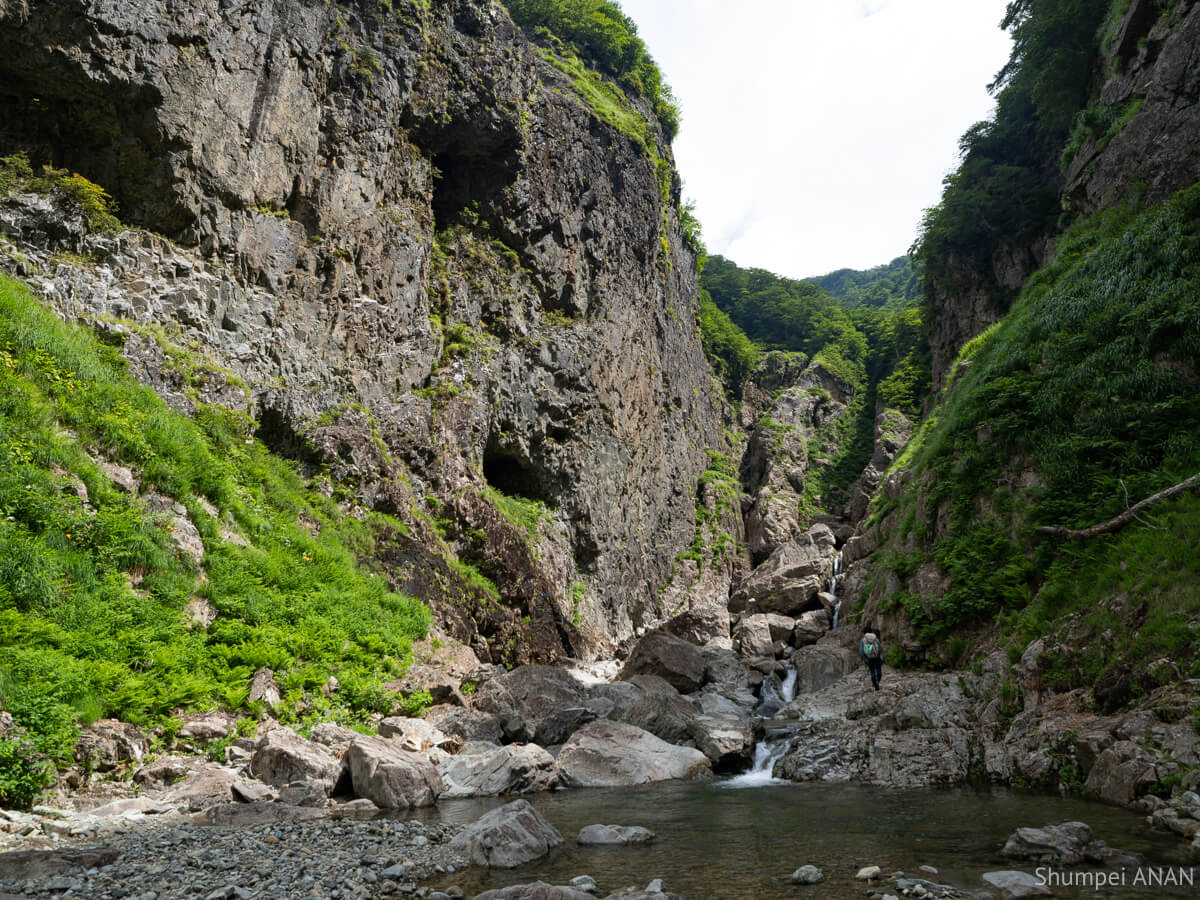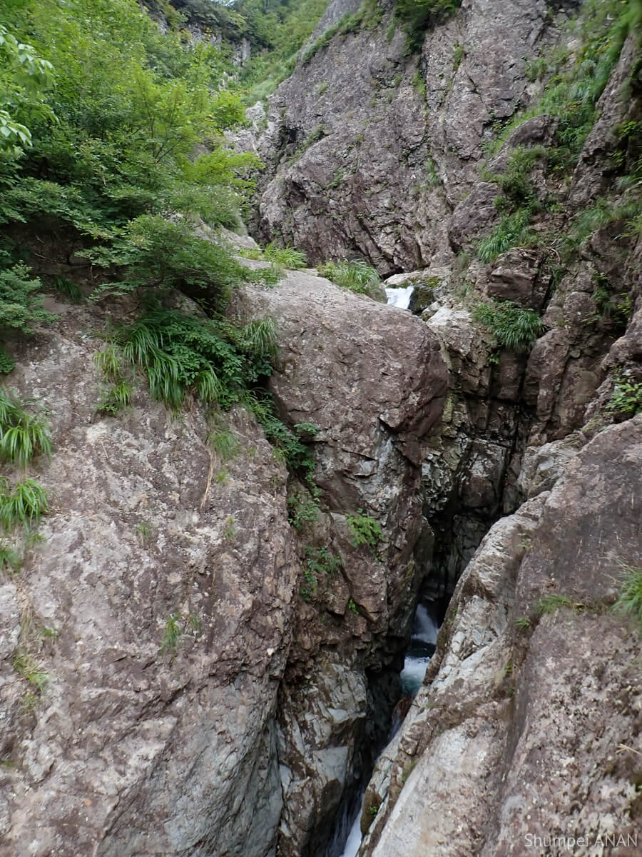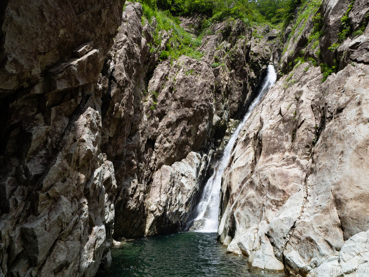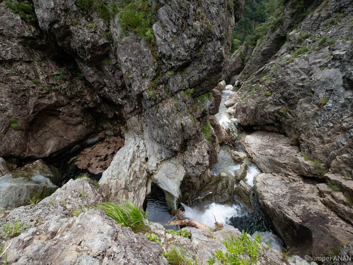 ドウドウセンのA滝は通称「口無しの釜」と言われている。上段の釜と下段の釜が岩の下で繋がっている天然サイフォンだ。 見た目のインパクトはそれほどでもないが、平坦な河原から突然ゴルジュと変わる様は興味深い光景だった。