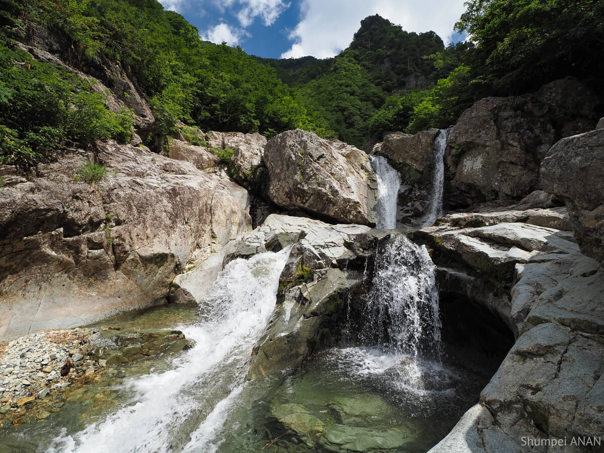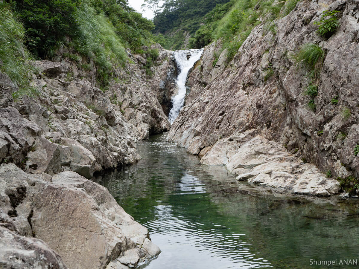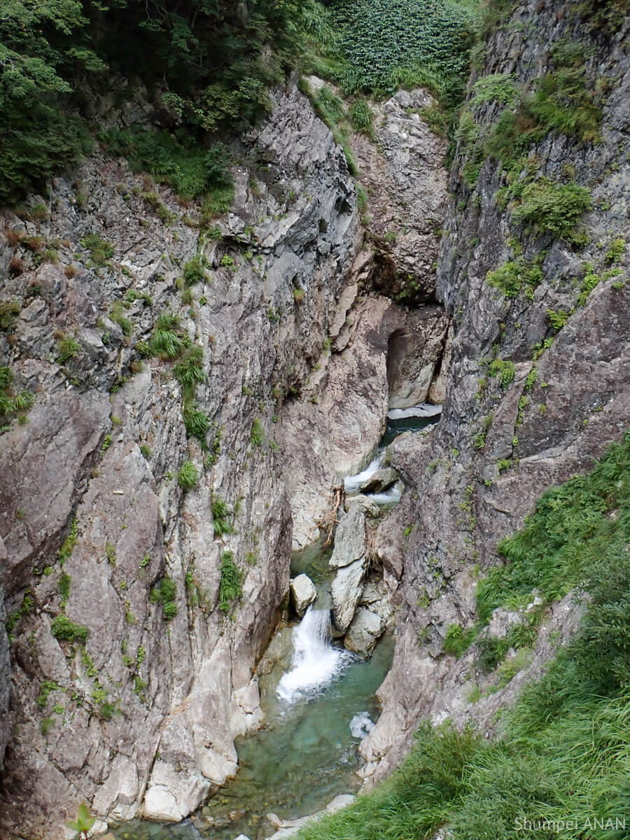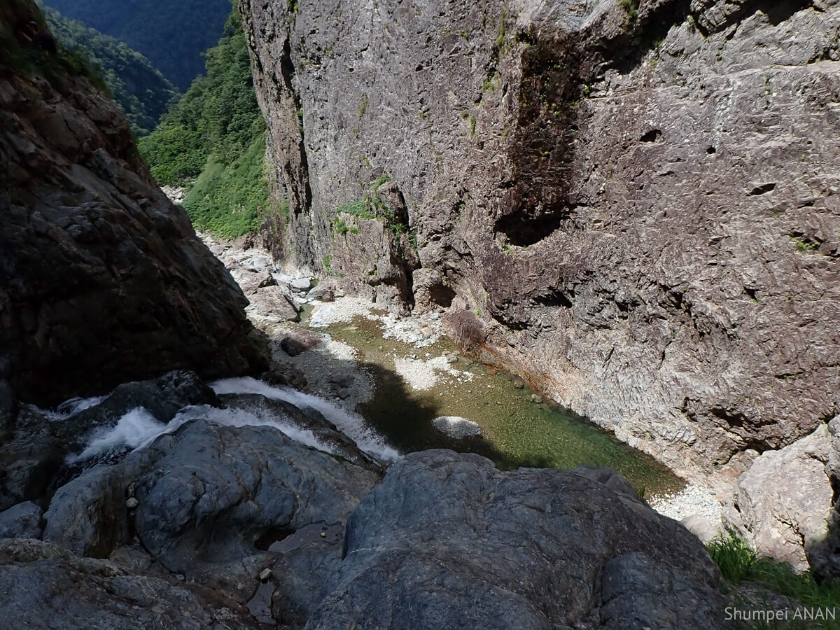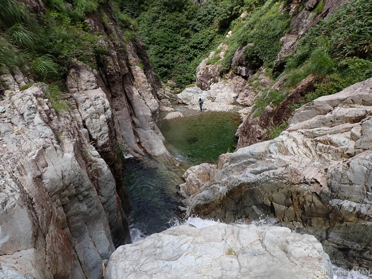 ドウドウセンのA滝は通称「口無しの釜」と言われている。上段の釜と下段の釜が岩の下で繋がっている天然サイフォンだ。 見た目のインパクトはそれほどでもないが、平坦な河原から突然ゴルジュと変わる様は興味深い光景だった。