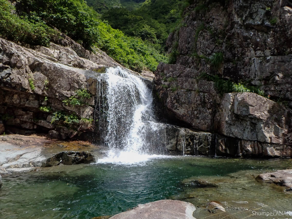 入渓してすぐに15mほどの直瀑:マワット下のセンが現れる。 周囲の岩盤と共に見事な景観だ。