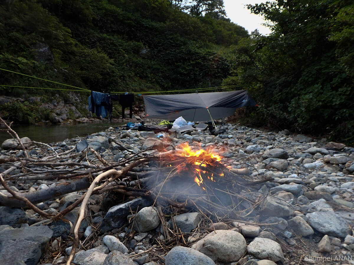 Co1400付近の河原は広くて幕営に適しており、ここでタープを張って焚き火を灯した。