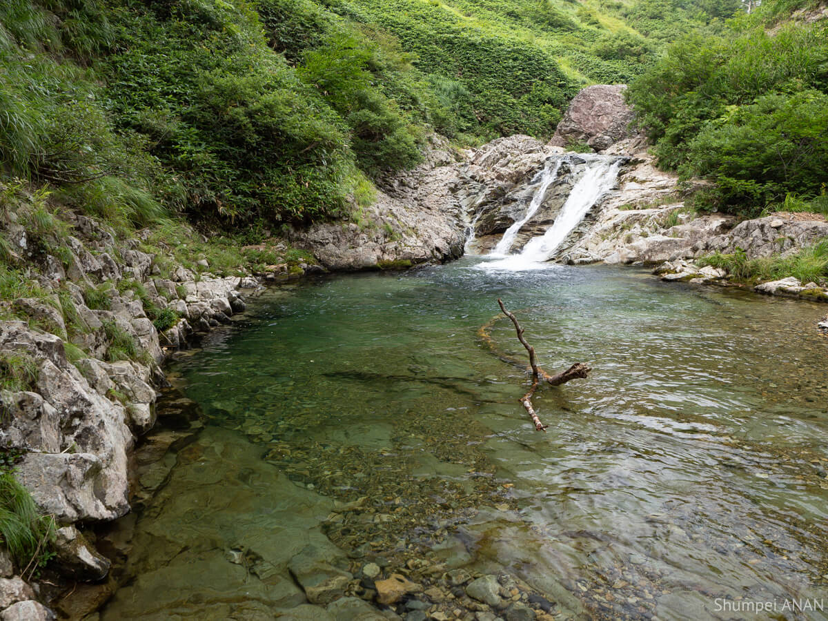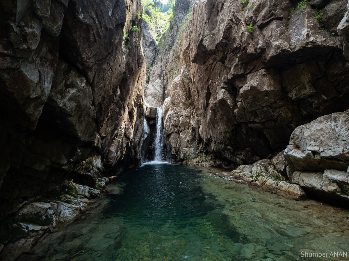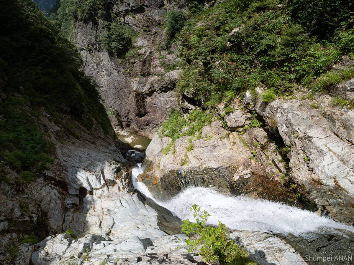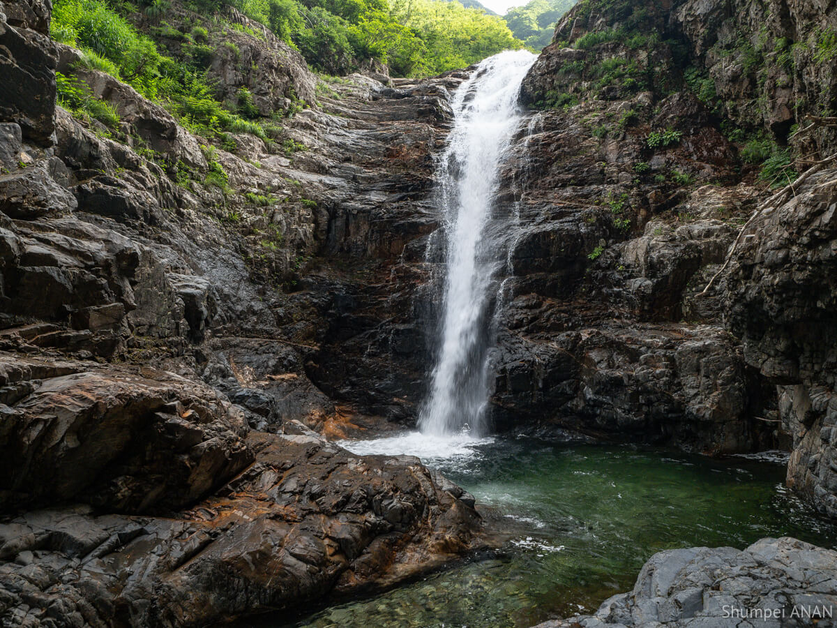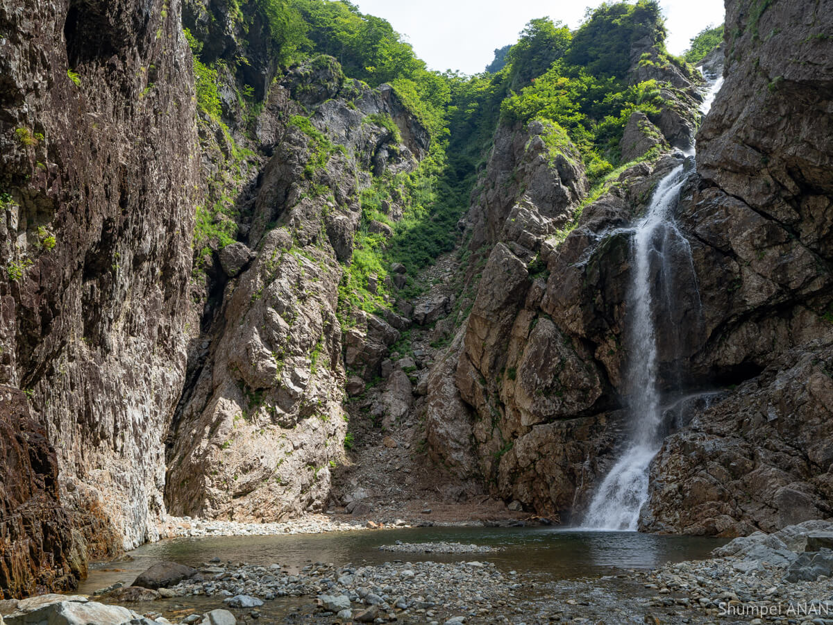 滝身は影の中なのが残念だが、その姿形や滝前の規模感は山域屈指の瀑布としての威厳を感じる神々しさだ。